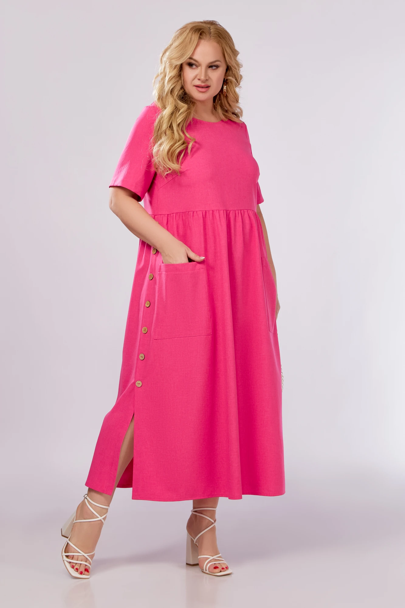 Лиф полочки с нагрудными выточками и округлым вырезом горловины, лиф спинки с центральным швом и V-образным вырезом горловины. Юбка состоит из передней и задней деталей с цельнокроенными планками по бокам, которые скреплены декоративными пуговицами. На передней детали юбки настрочены накладные карманы. Юбка на хлопковой подкладке.