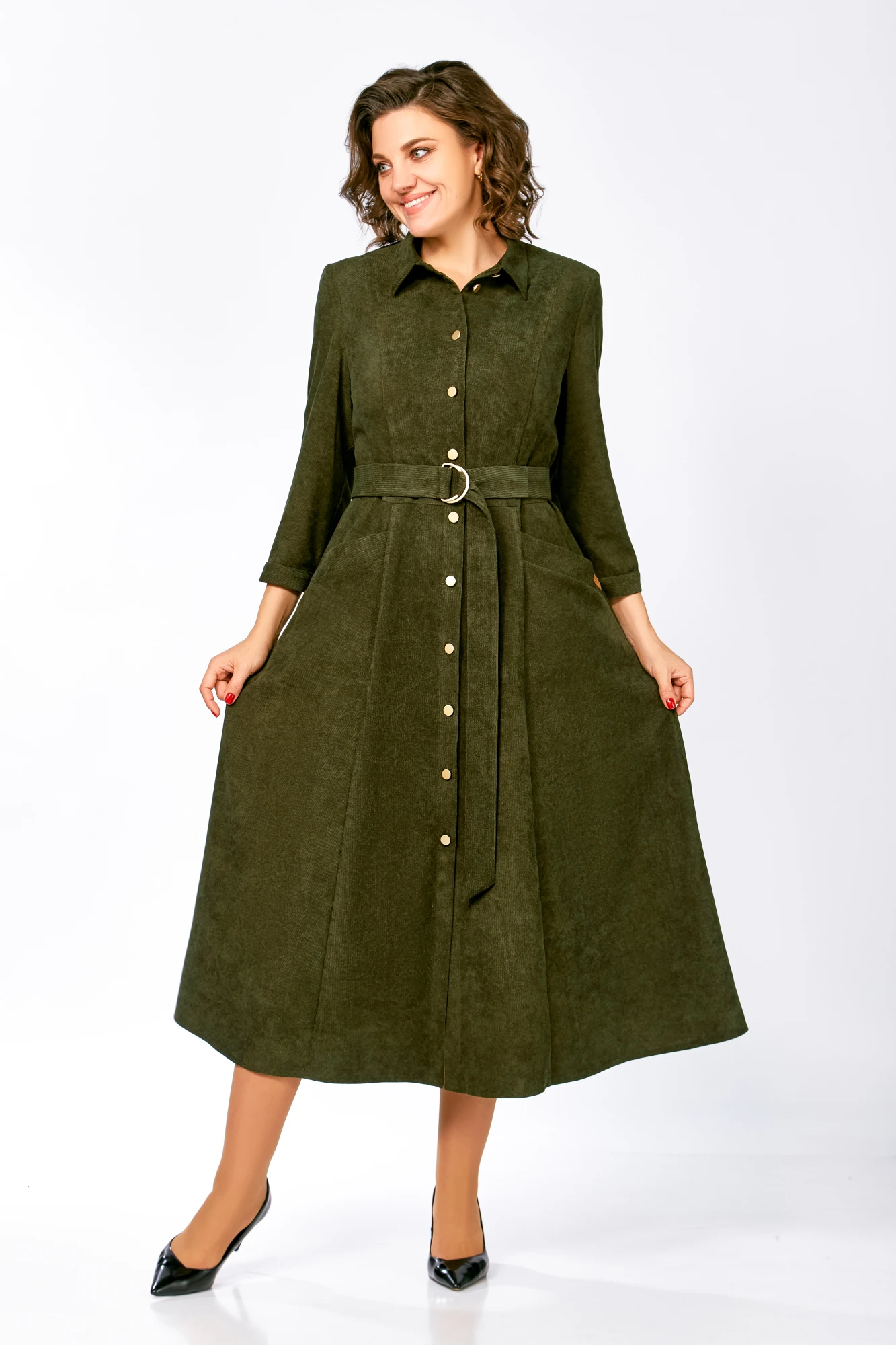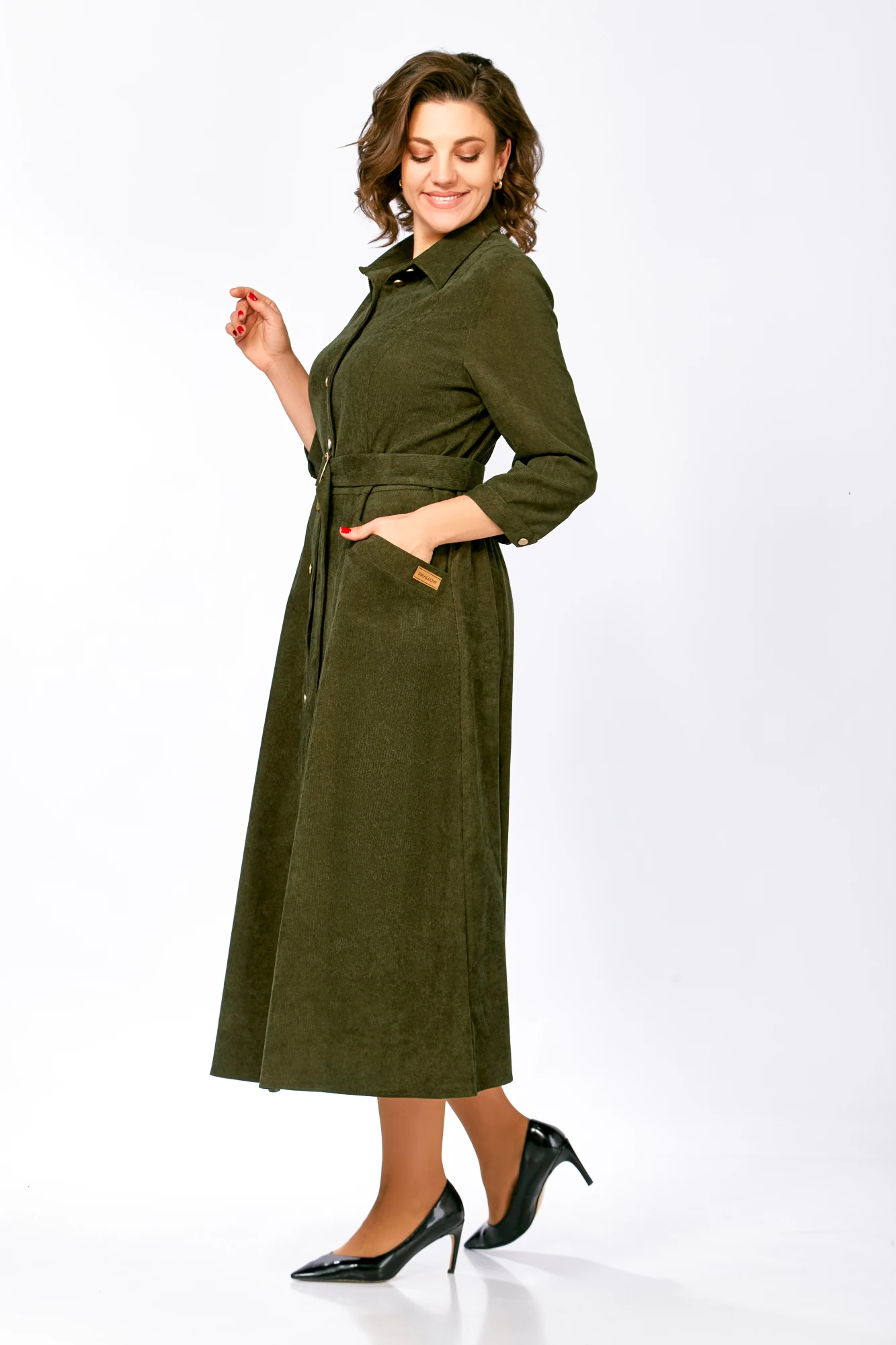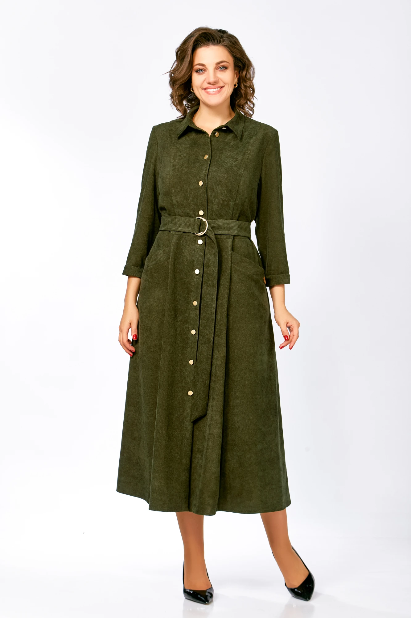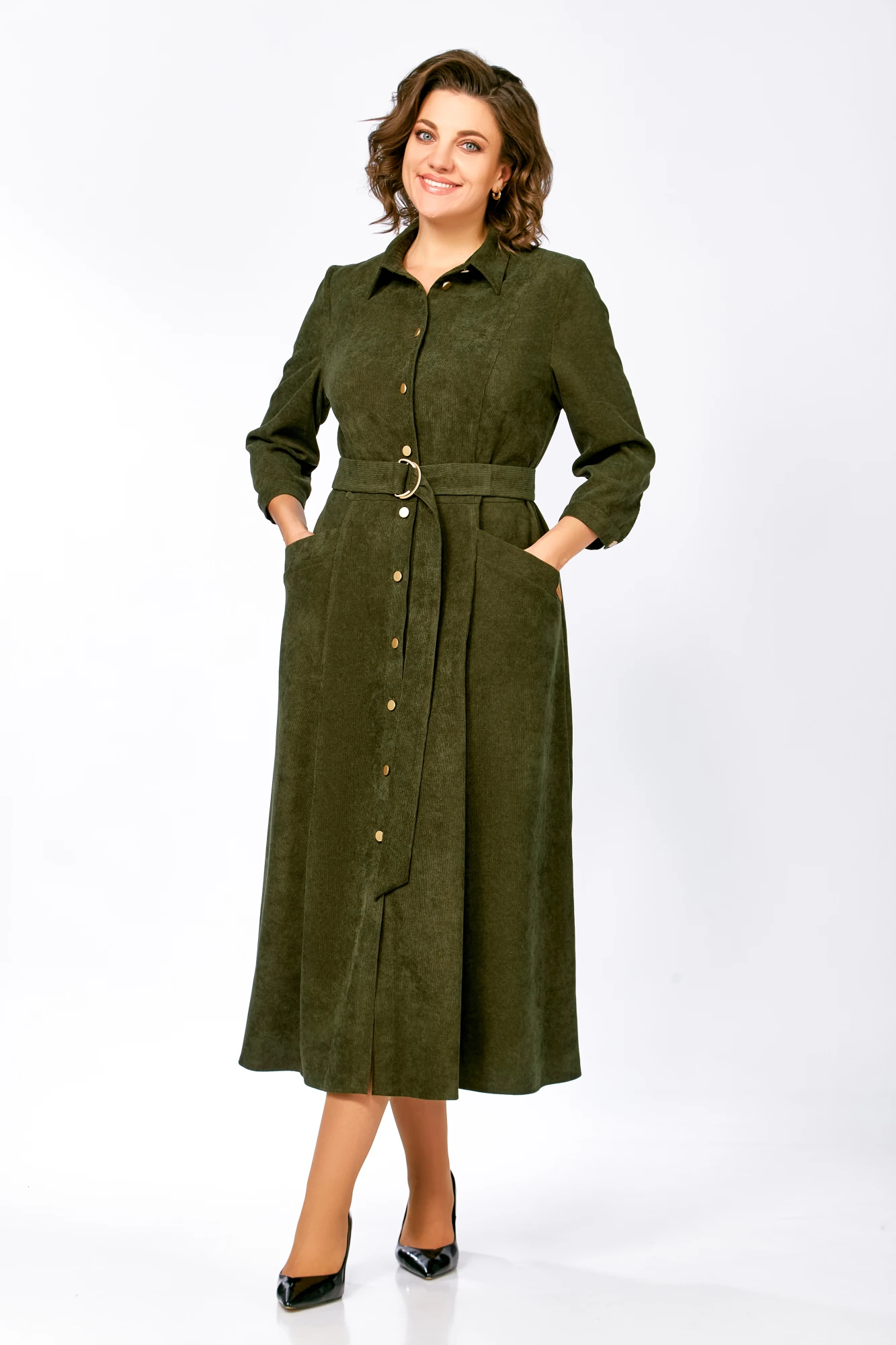 Платье комплектуется поясом из основной ткани, с декоративными полукольцами.