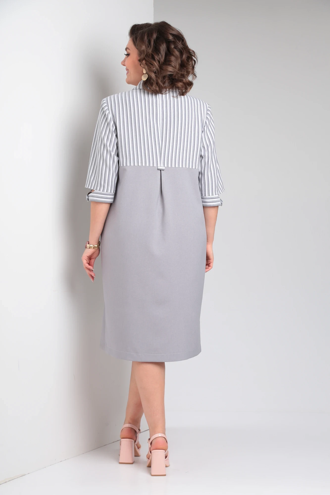 Перед платья асимметричный с наклонным подрезом, нагрудными вытачками, рельефами и двумя парами карманов (накладные и внутренние в шве рельефа). Застёжка центральная бортовая на семь петель и пуговиц. Горловина обработана рубашечным воротником. Спинка с подрезом и выходящими из него складкой и декоративной шлёвкой. В боковых швах обработаны разрезы. Рукав втачной с отрезной манжетой на пуговице, длиной 3/4. Отделкой изделия служит металлическая фурнитура (может отличаться от представленной на фото).