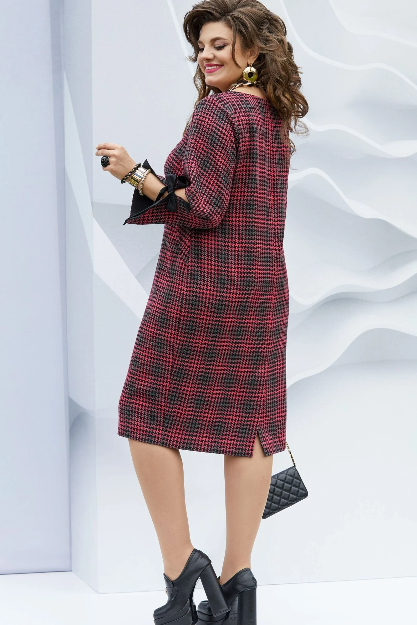 Длина платья от высшей точки плечевого шва до низа 106 см (р 48-52), 108,5 см (р 54-58). Длина рукава 57 см.