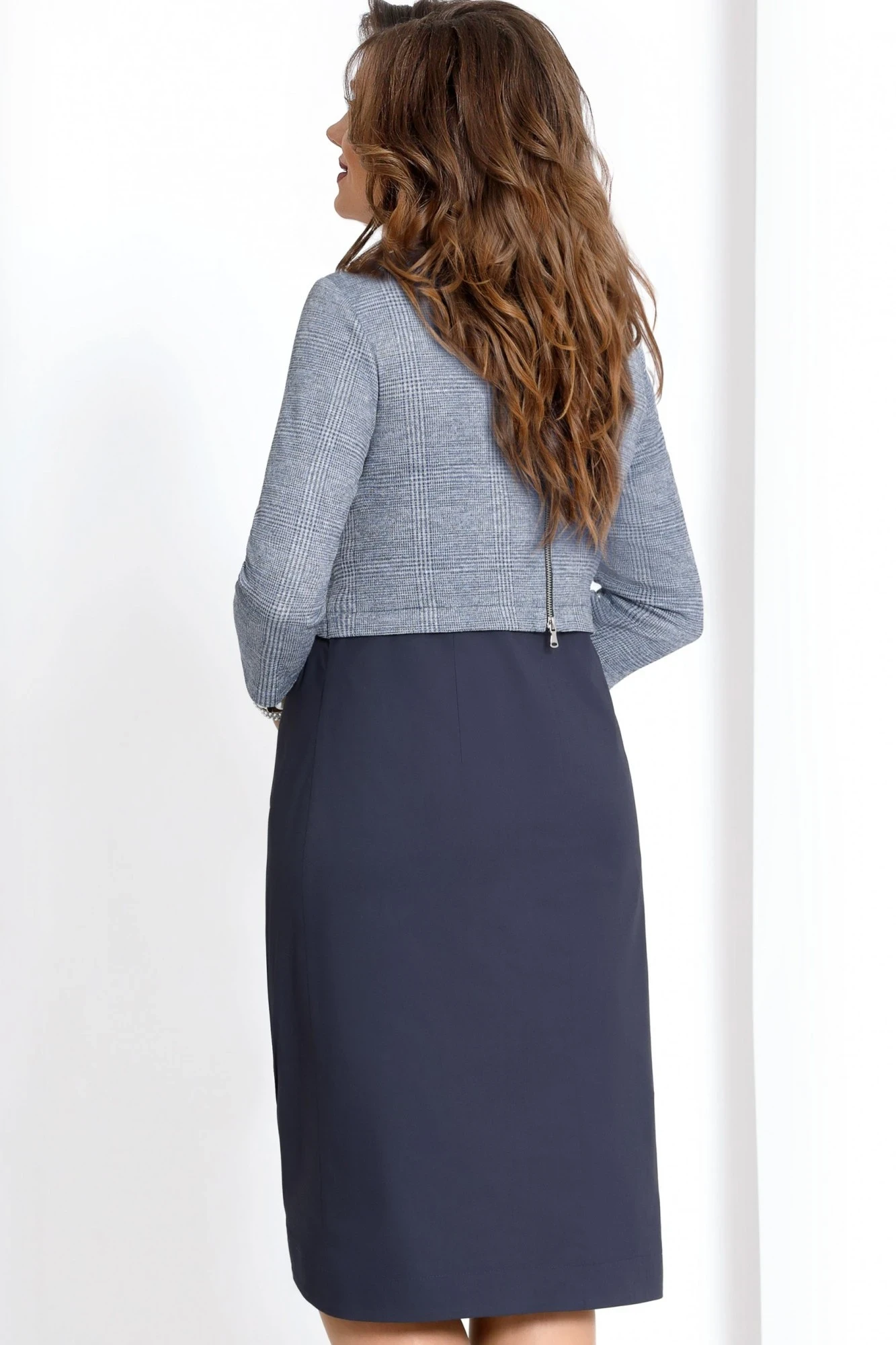 Платье женское полуприлегающего силуэта. Перед с фигурным подрезом выше линии талии. Верхняя часть переда с плечевыми вытачками и настроченными декоративными элементами. Нижняя часть переда с отрезными бочками и накладным карманом. Спинка с горизонтальным подрезом по линии талии. Верхняя часть спинки с имитацией застежки на разъёмную тесьму-молнию. Нижняя часть спинки с талиевыми вытачками и средним швом. Рукав втачной одношовный.