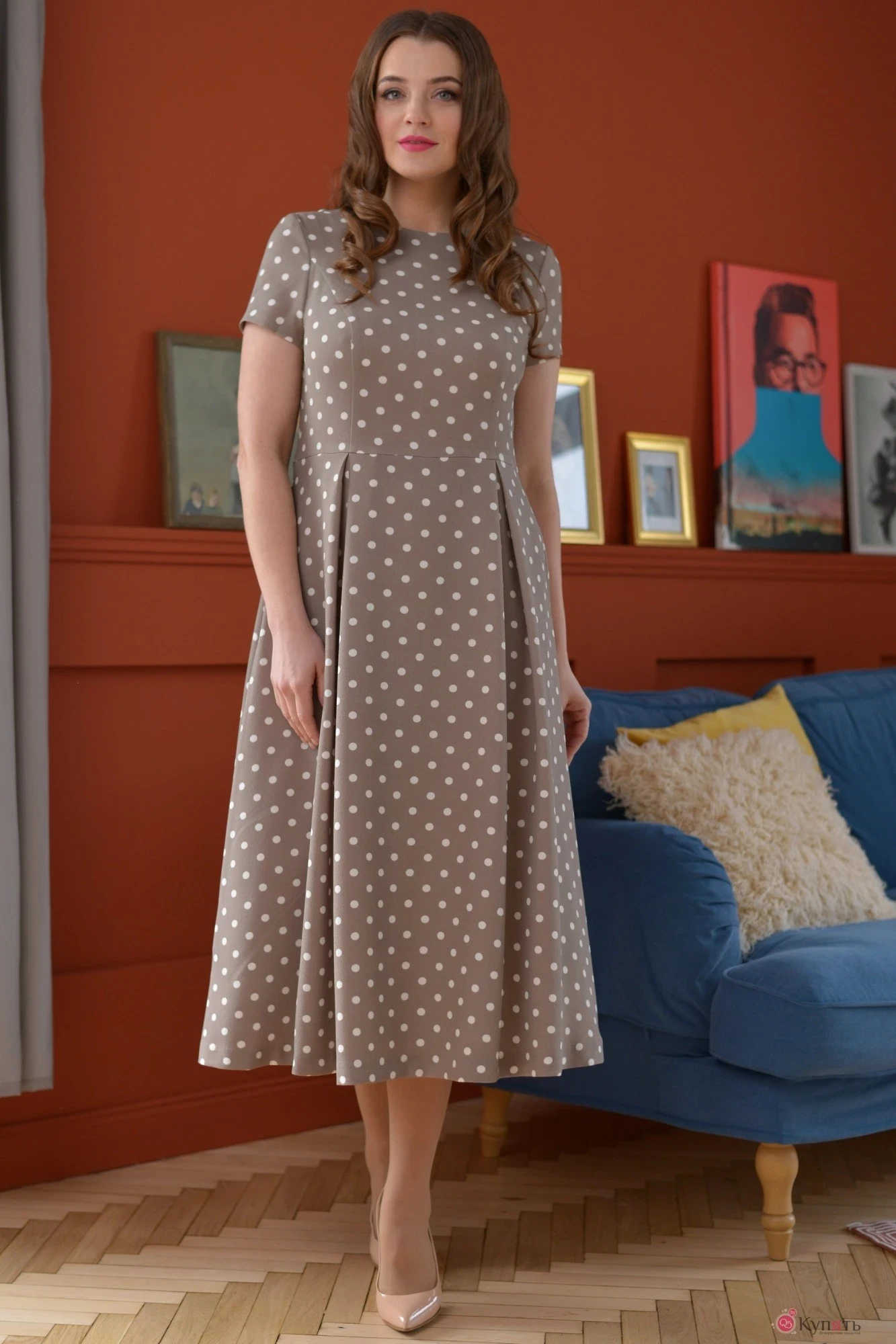 Бежевое платье в горошек уместно смотрится как на романтическом свидании, на вечеринке, на прогулке, и даже в офисе. Такая расцветка подходит модницам любого возраста и с любым типом фигуры. Она молодит, освежает и всегда модно смотрится. Костюм женский, нарядный состоит из платья силуэта «песочные часы» и жакета, полуприлегающего силуэта, на подкладке. Костюм как нарядный, так и для повседневной носки. Платье женское отрезное по линии талии. Перед платья с рельефными швами на лифе, выходящими из проймы. Юбка с 2-я бантовыми складками на продолжении рельефных швов лифа. Спинка со средним швом, талевыми выточками на лифе и бантовыми складками на юбке. В среднем шве спинки обработана потайная тесьма-молния. Рукава короткие, втачные одношовные. Горловина круглой формы, обтачная. Жакет женский с двубортной застёжкой на петли и пуговицы. По низу жакета от талии притачная баска. Перед с рельефными швами, выходящими из проймы и идущими до баски. Спинка со средним швом и рельефными швами выходящими из проймы и идущими до баски. На боковых швах на уровне линии талии настрочены шлёвки для протягивания ремня. Горловина V-образной формы с притачным широким воротником и с притачными лацканами с острыми концами Рукава втачные двухшовные длинные.