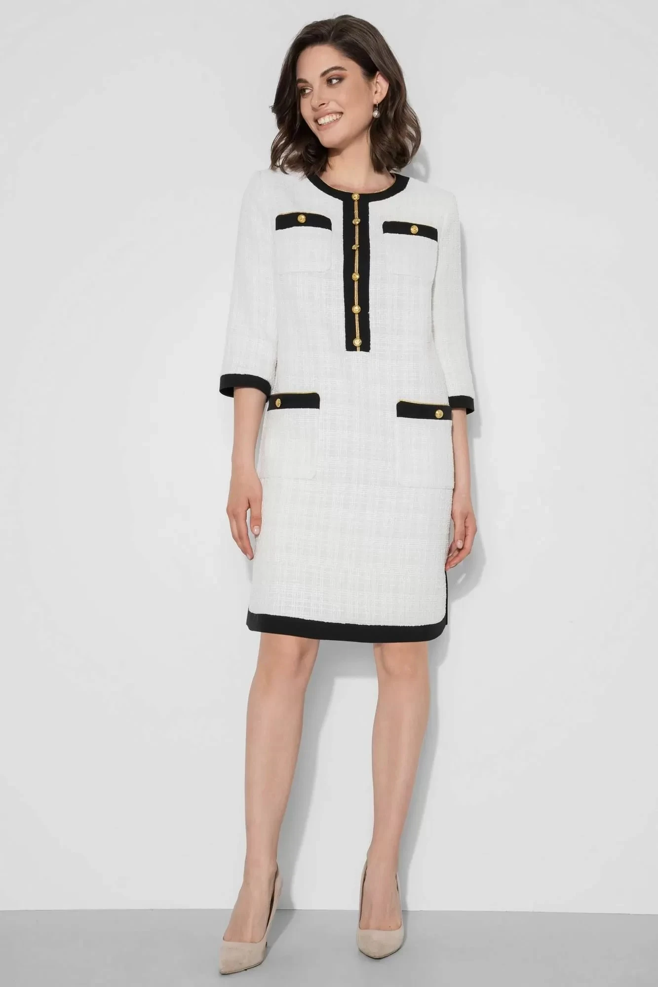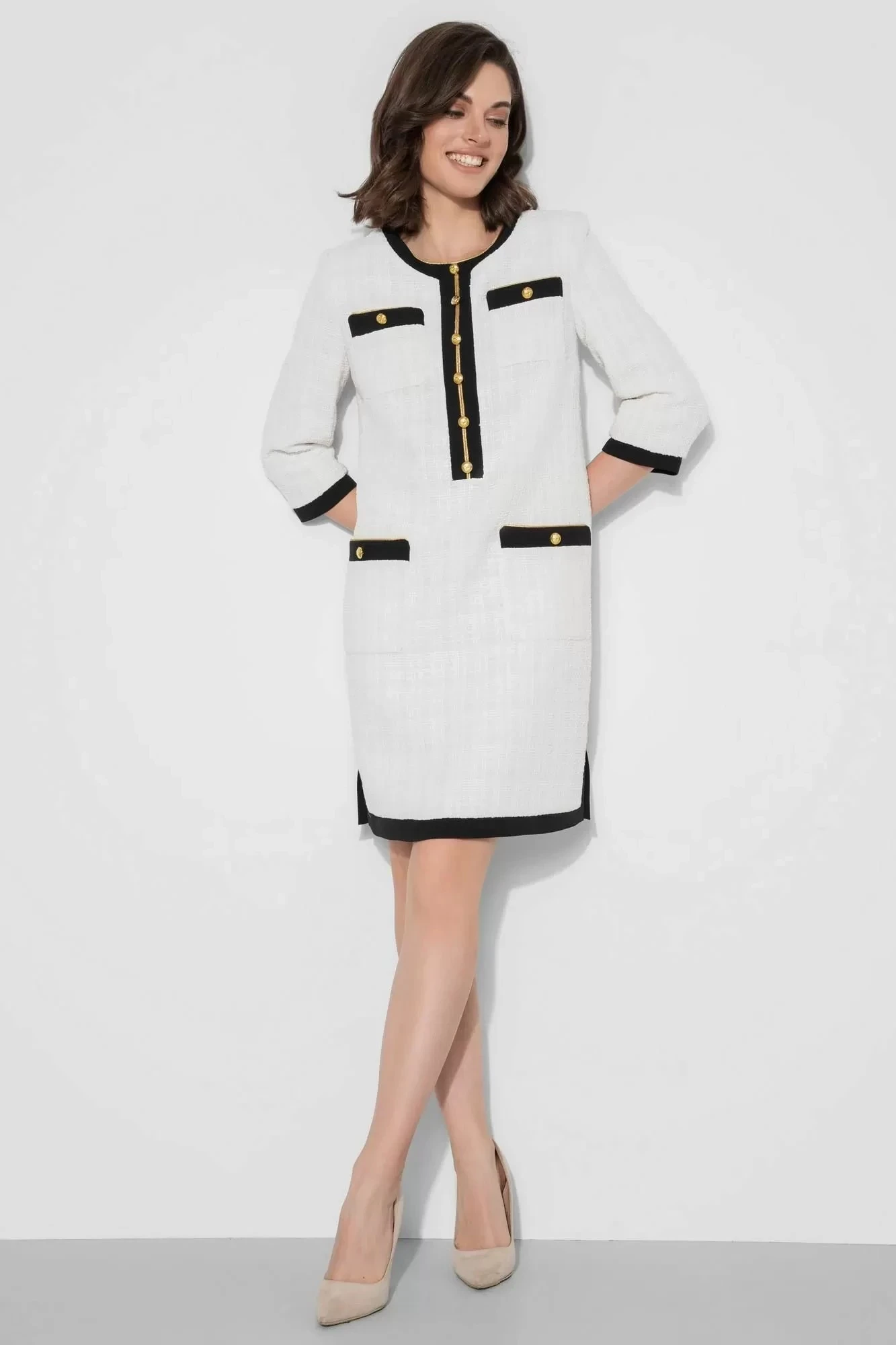 46,48,50,52,54, 56Перед платья с нагрудной вытачкой, выходящей из бокового шва, с двумя парами накладных карманов, с закругленными углами. С центральной планкой от линии талии до верху с 5 декоративными пуговицами (размер и цвет фурнитуры может незначительно отличаться от фото). Нагрудные карманы по размеру немного меньше, чем нижние. Нижний карман расположен на уровне линии бедра. Верхний край карманов с планками из отделочной ткани и пуговицей. По середине центральной планки, горловине и верхнему срезу карманов - втачной кант.