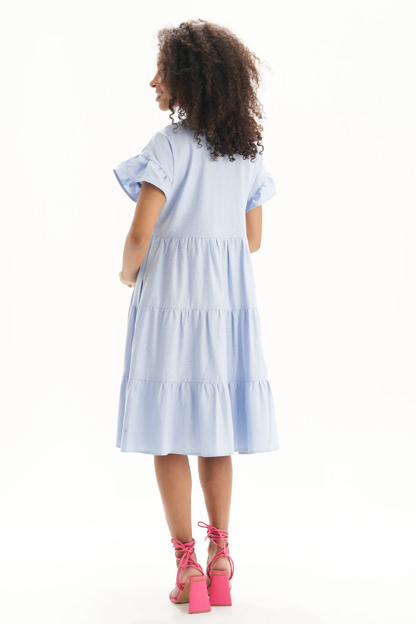 Горловина круглой формы, по переду с отрезными фигурными планками. Нижняя часть платья переда и спинки с тремя ярусами воланов со сборкой.