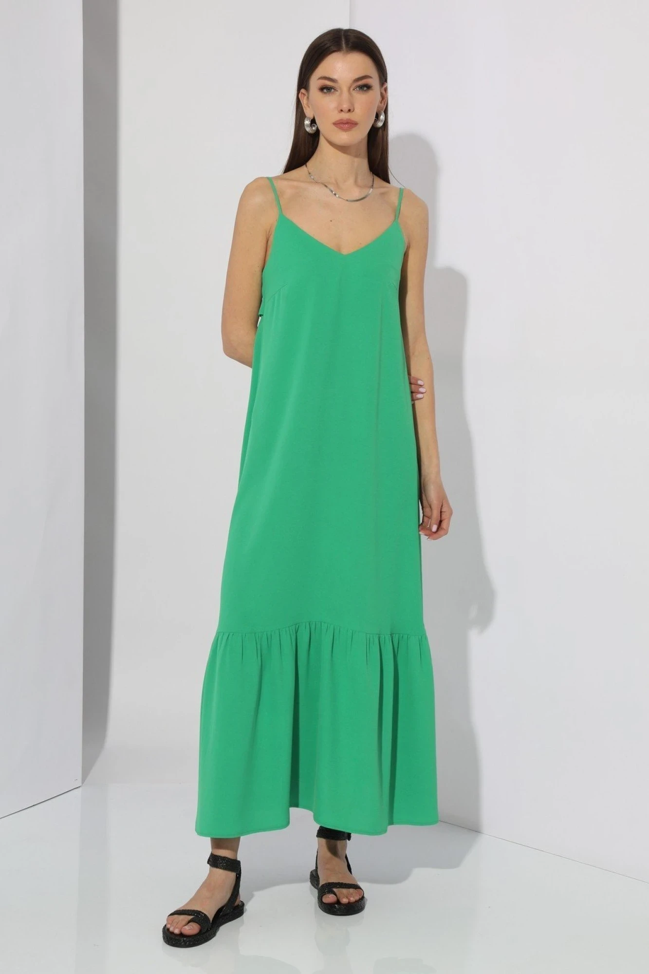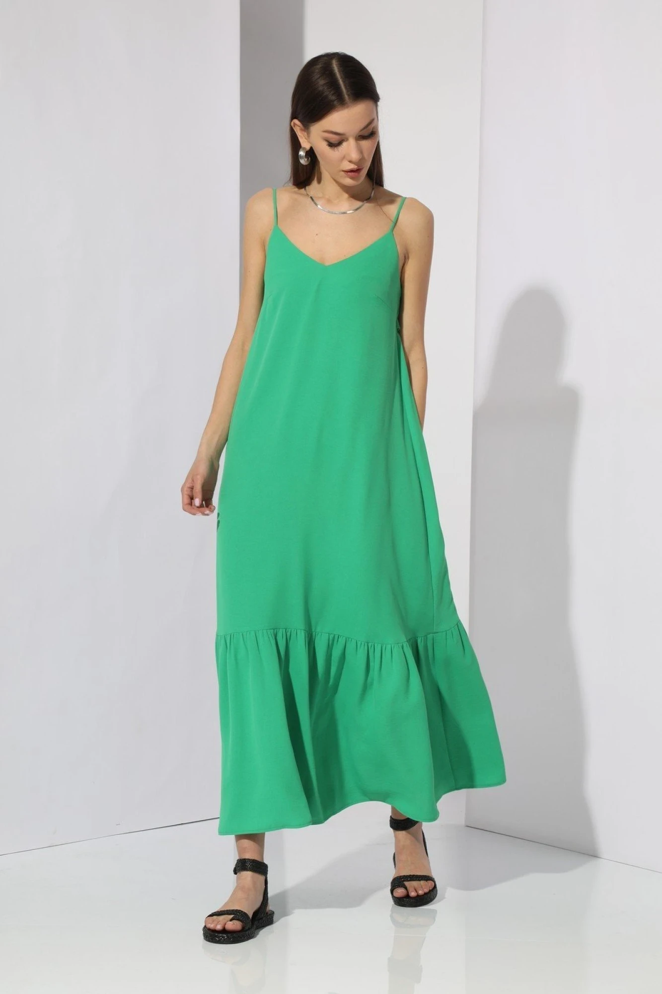 Перед и спинка цельные, с V-образным вырезом. На переде расположены нагрудные вытачки. В боковые швы вставлен пояс. По низу платья притачен волан.