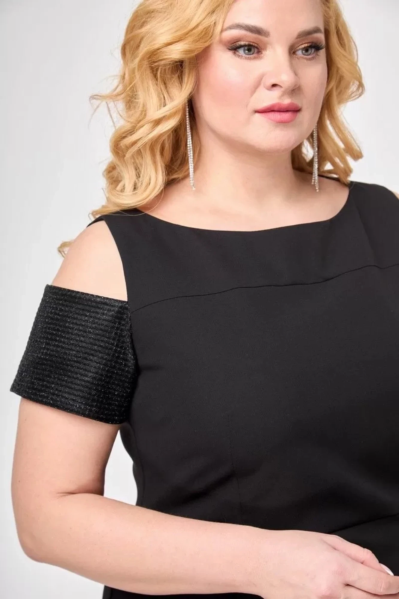 Полуприлегающий силуэт с открытой линией плеча.