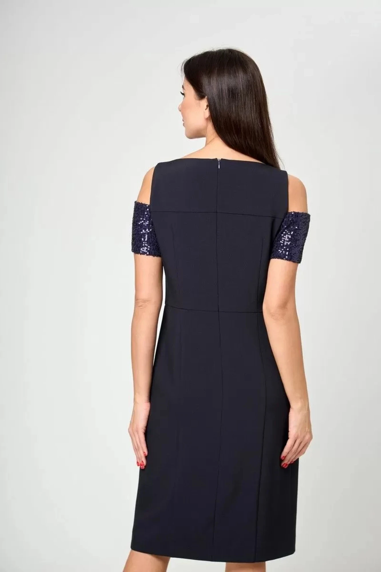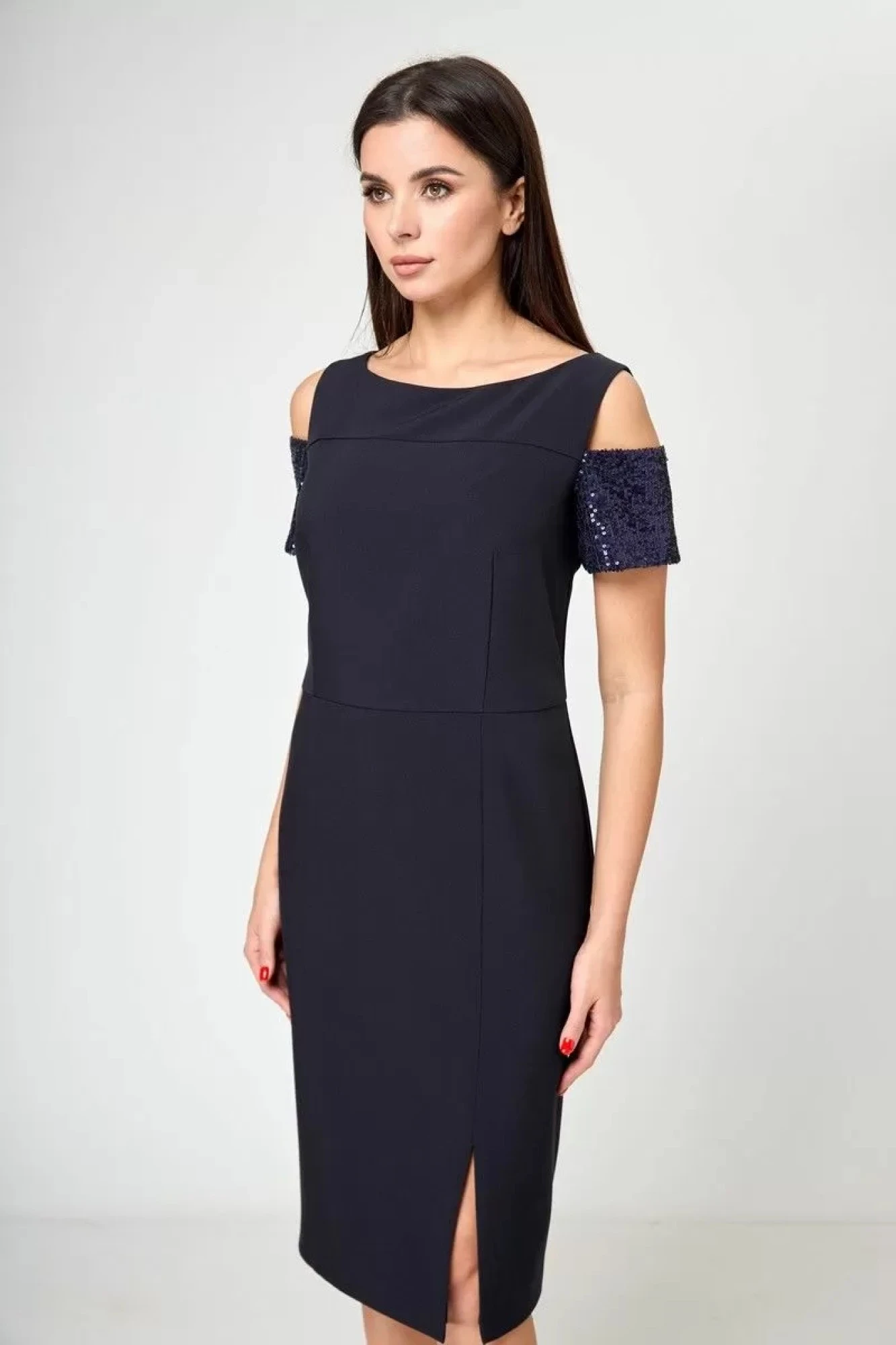 Пайетки на этом Платье -футляре смягчают его строгость .