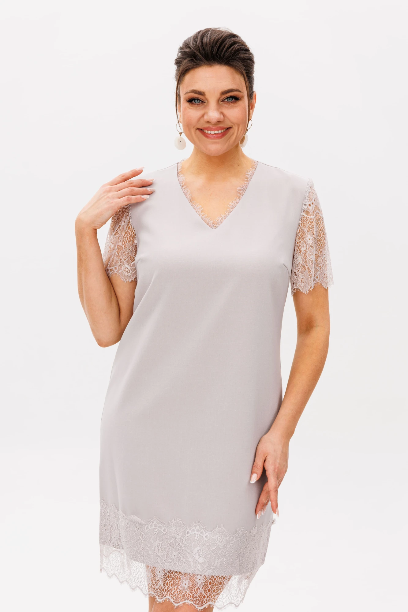 Изящное короткое платье, украшенное изысканным французским кружевом, станет жемчужиной вашего гардероба. Нежное кружево обрамляет V-образный вырез горловины, рукава и подол, добавляя образу воздушности и романтичности.