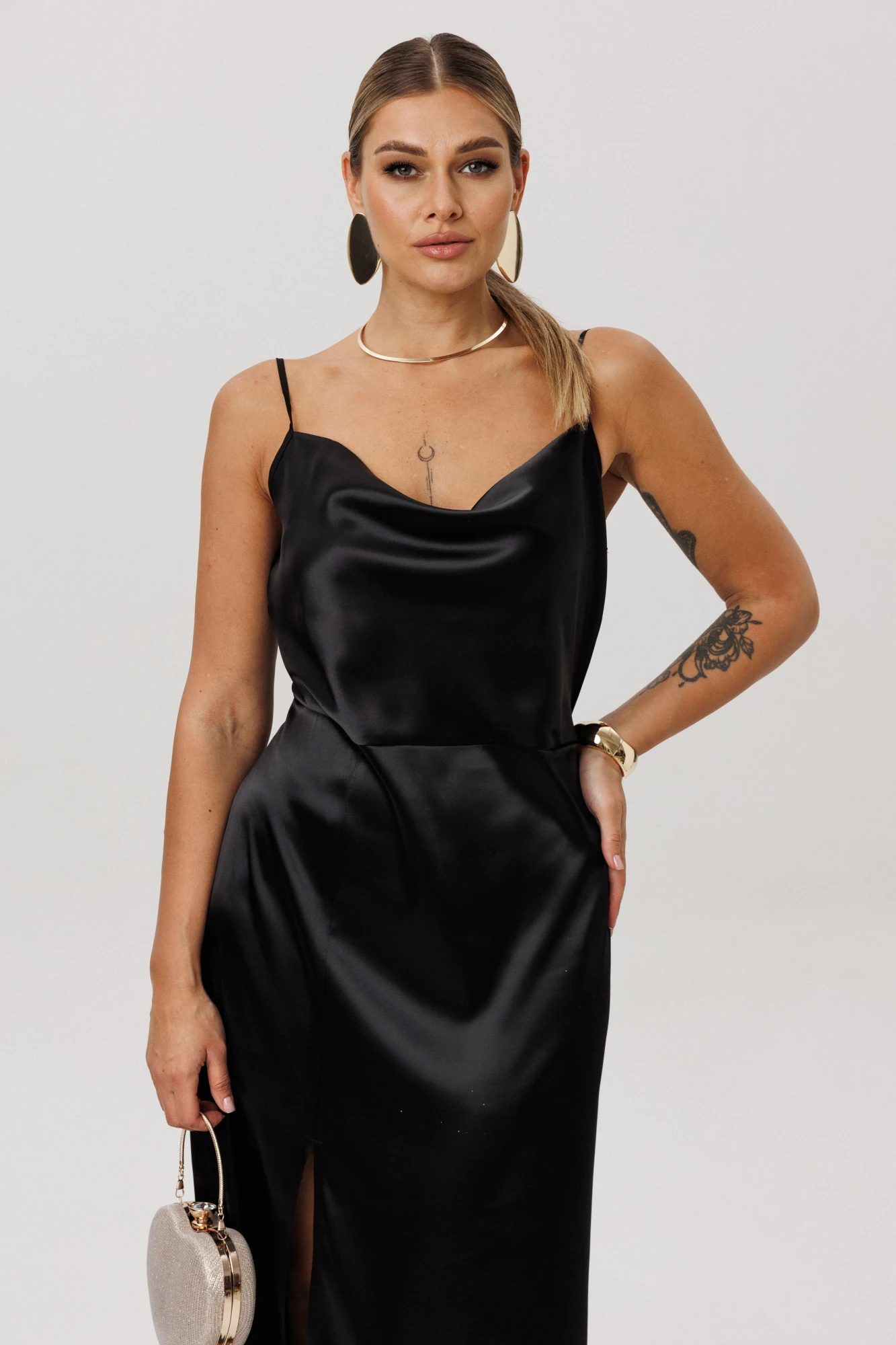 Платье актуальной во все времена длины миди с игривым разрезом изящно струится во время движения, приковывая взгляды. В правом боковом шве спрятана потайная молния. Вырез платья-качели нежно ниспадает, подчеркивая декольте и делая образ соблазнительным.