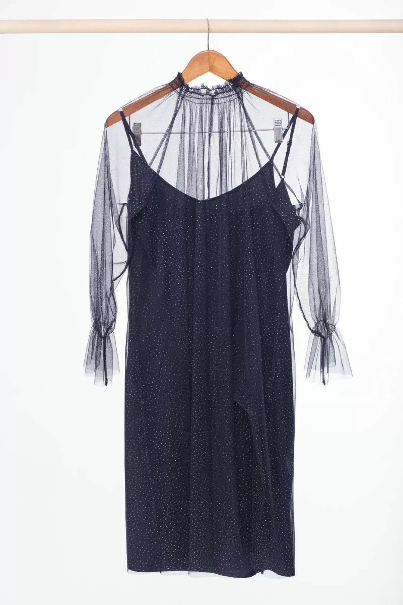 Верхнее платье выполнено из сетки с мерцающими блестками.