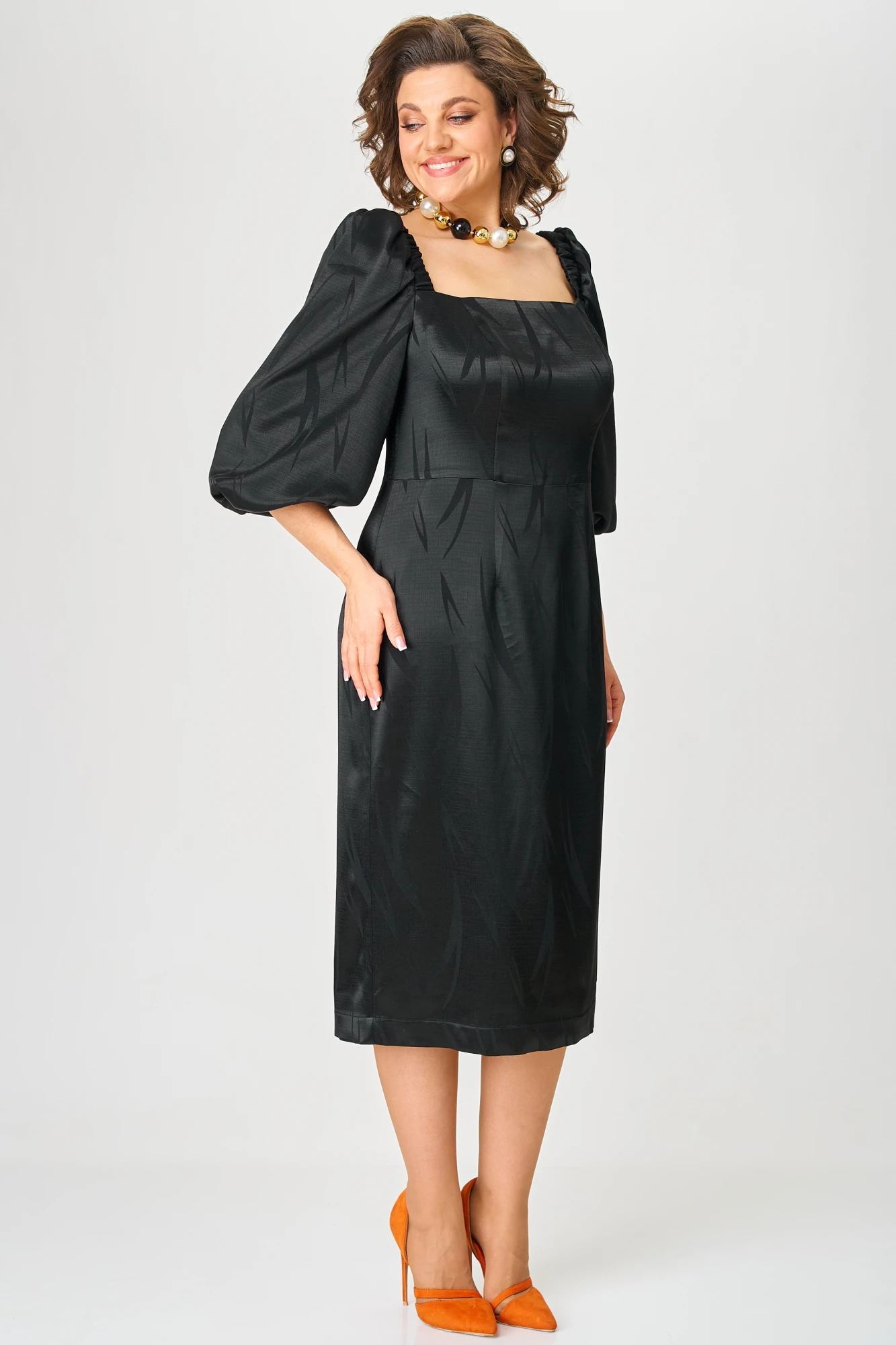 Платье приталенного силуэта, чуть ниже колена из костюмно-плательной ткани. Вырез горловины квадратной формы. Отрезное по линии талии. Перед и спинка с рельефами. По спинке средний шов, в котором вставлена потайная молния, внизу разрез. Рукав втачной широкий длинный, по окату собран на резинку. Длинный рукав легко превратить в три четверти с помощью резинки, вставленной по низу рукава. В комплект входит пояс из основной ткани.""Длина платья: 100 см