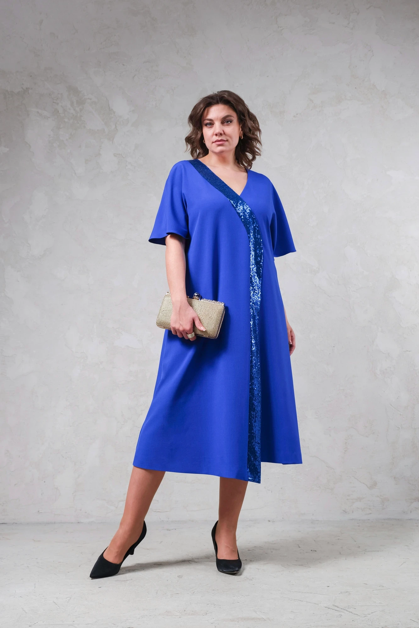 48, 50 ,52,54, 56 ,58Выполнено из 2-ух видов материалов. Спинка со средним швом. Рукав цельнокраеный, со спущенной линией плеча. Передняя часть платья выполнена декоративной планкой в виде пайеток.