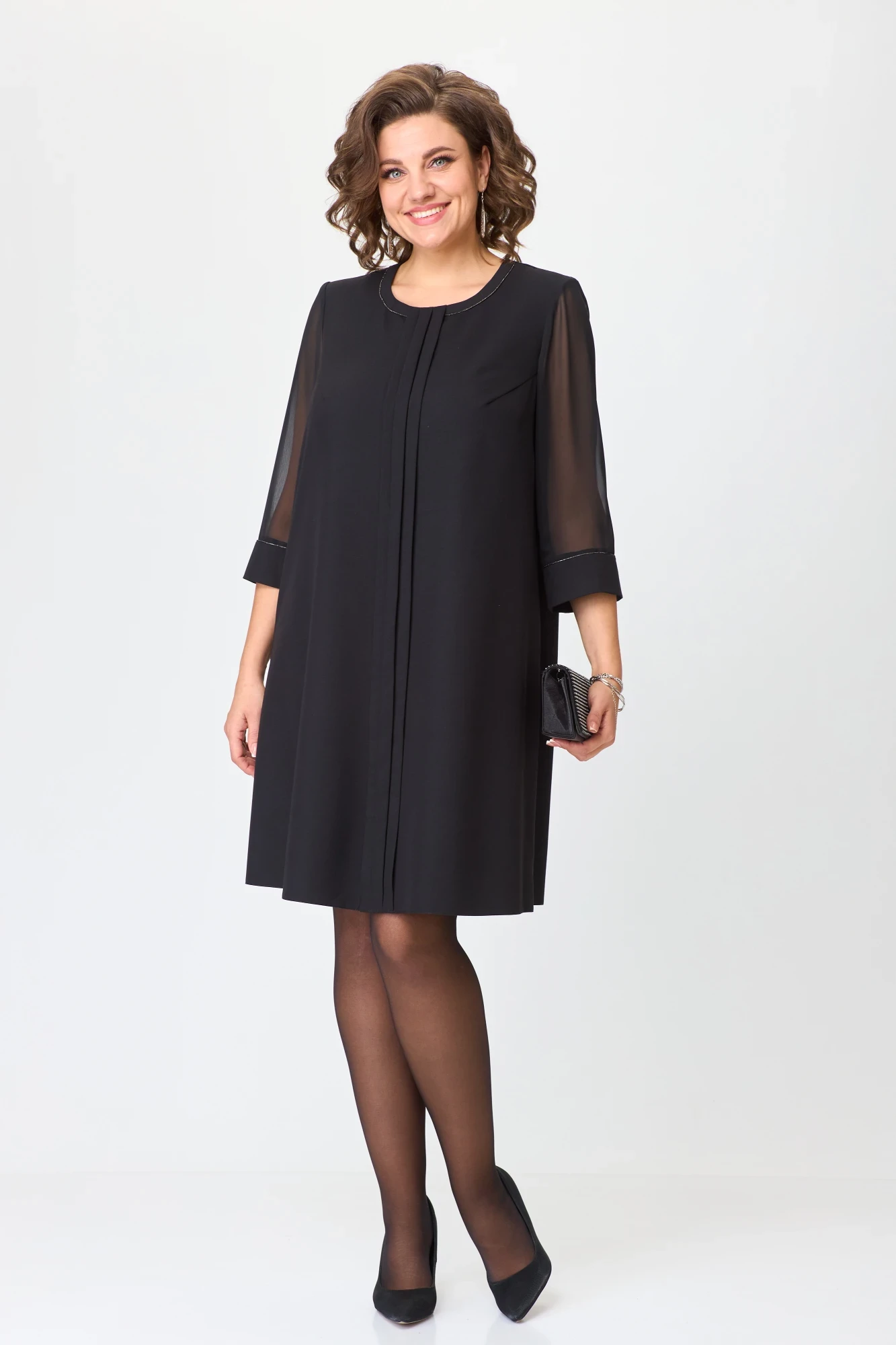 Платье женское А-силуэта, выполнено из плательной ткани в сочетании с шифоном. Горловина платья округлой формы, с планкой, которая декорирована отделочной тесьмой. По центру полочки выполнены складки, которые зрительно вытягивают силуэт. Есть нагрудные выточки, выходящие из проймы. Рукав втачной, одношовный из шифона. Низ рукава на притачной манжете с декоративной тесьмой. Спинка платья разрезная с «капелькой» и застежкой на навесную петлю и пуговицу. Платья прекрасно подходит для корпоративов, новогодних праздников и других торжеств. Платье скроет недостатки и придаст нарядный и элегантный вид.