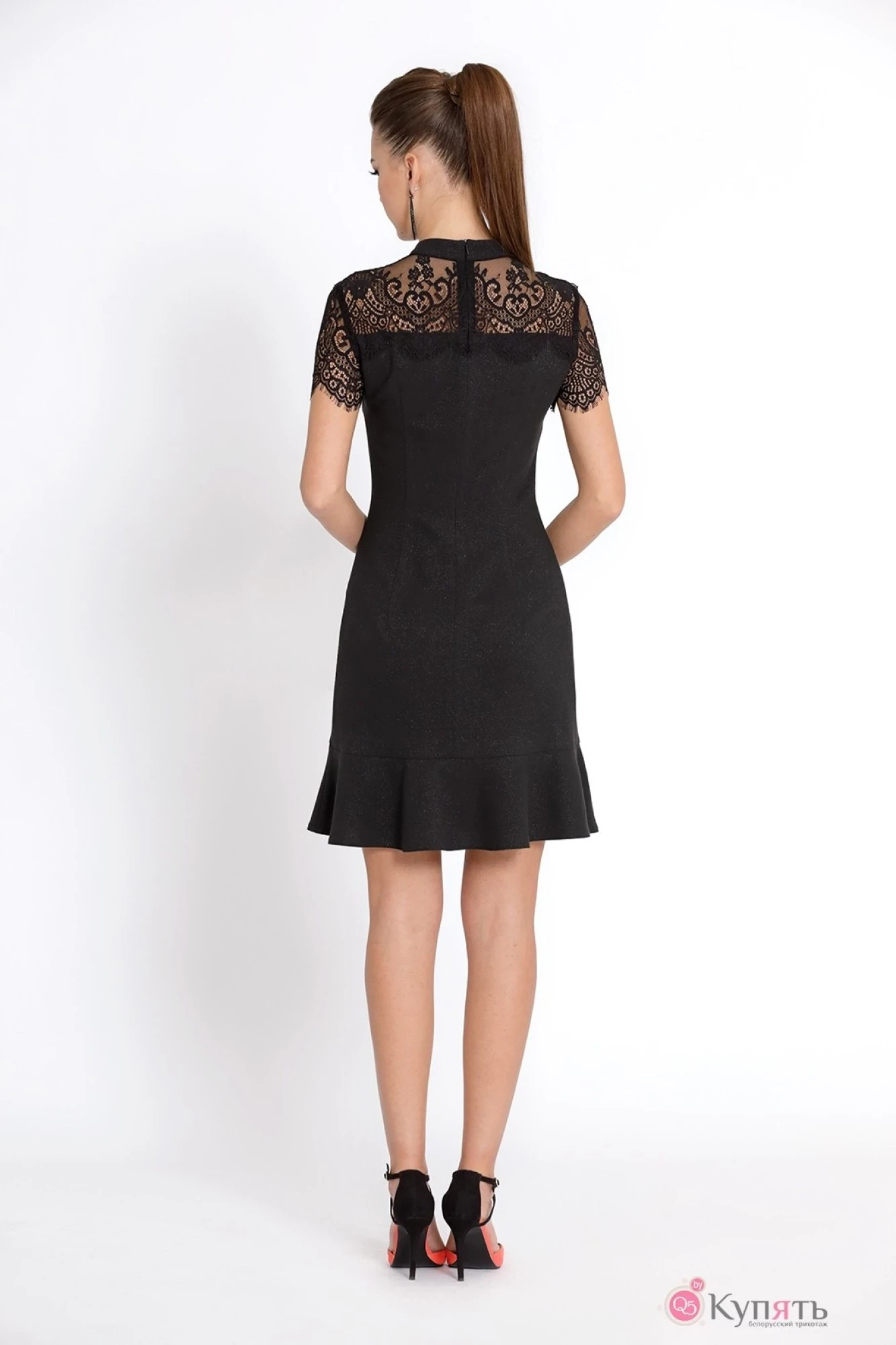 Платье выполнено из плательной ткани прилегающего силуэта, на кокетке по переду и спинке из кружева. Воротник-стойка из основной ткани, застежка в среднем шве спинки на потайную молнию. Рукав короткий из кружева. По низу платья - волан из основной ткани.