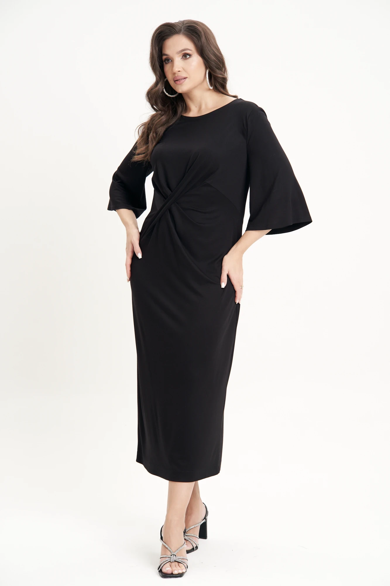 Полуприлегающий силуэт, втачной покрой, эффектный вырез лодочкой, рукав, расширенный внизу, длиной 3/4.