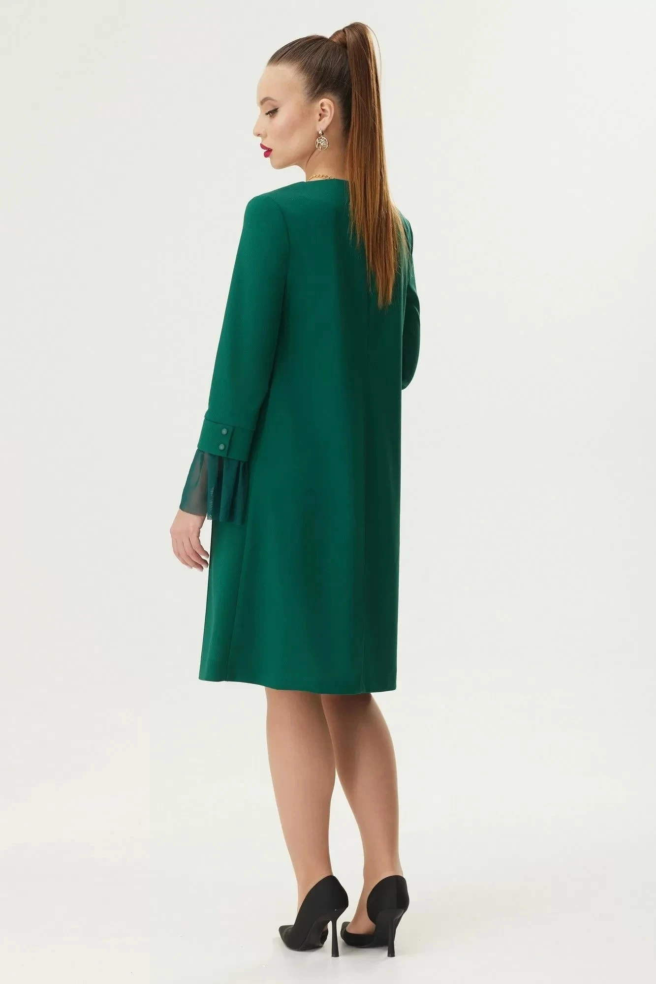 Платье женское А- образного силуэта выполнено из трикотажного крепа с мелким блеском. По переду платья расположены пять отделочных защипов, которую зрительно вытягивают фигуру. Рукав втачной одношовный, низ которого оформлен манжетой с пуговицами и сеточкой. Спинка со средним швом и потайной молнией вверху. Отделкой платья служит декоративная брошь.