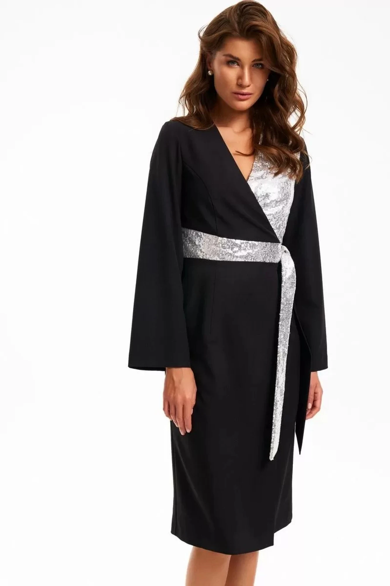 Платье длиной ниже линии колена с притачным поясом (одна сторона выполнена из «пайетки»), который можно завязать на бант.