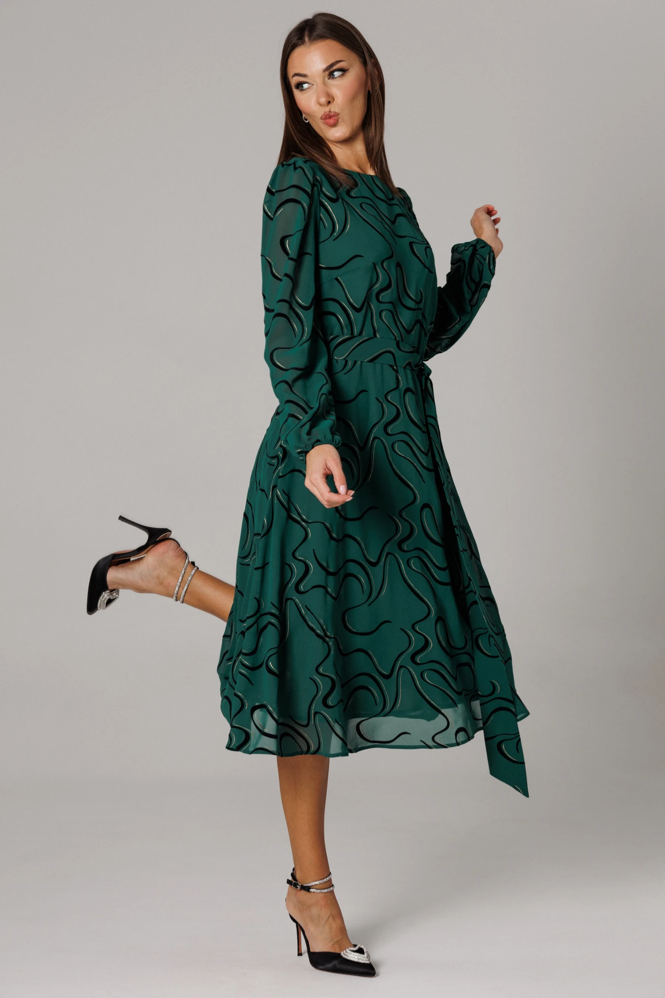 Чтобы подчеркнуть изящество талии: платье дополнено съемным текстильньм поясом, который может быть завязан на бант или классический узел.