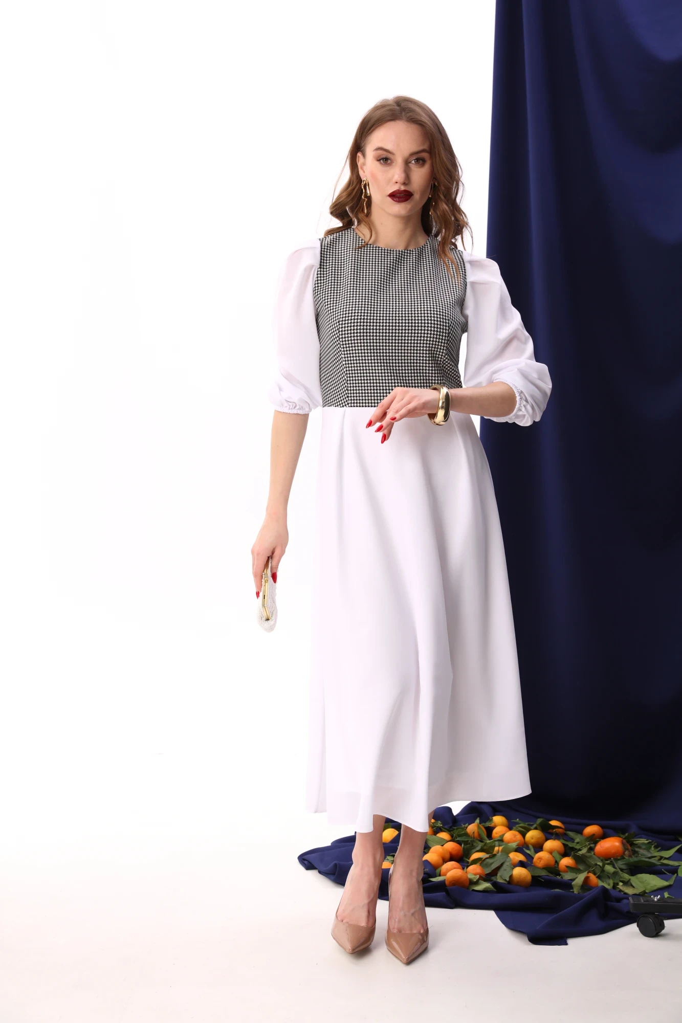 Вечернее платье с шифоном NikVa 416-8 белый/черно-белый гусь лапка