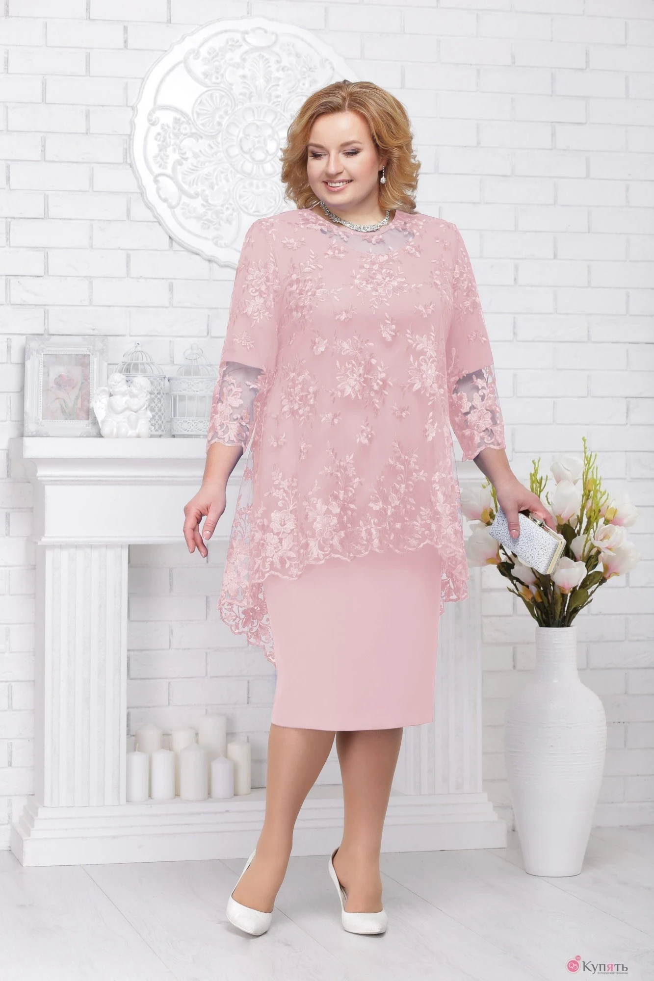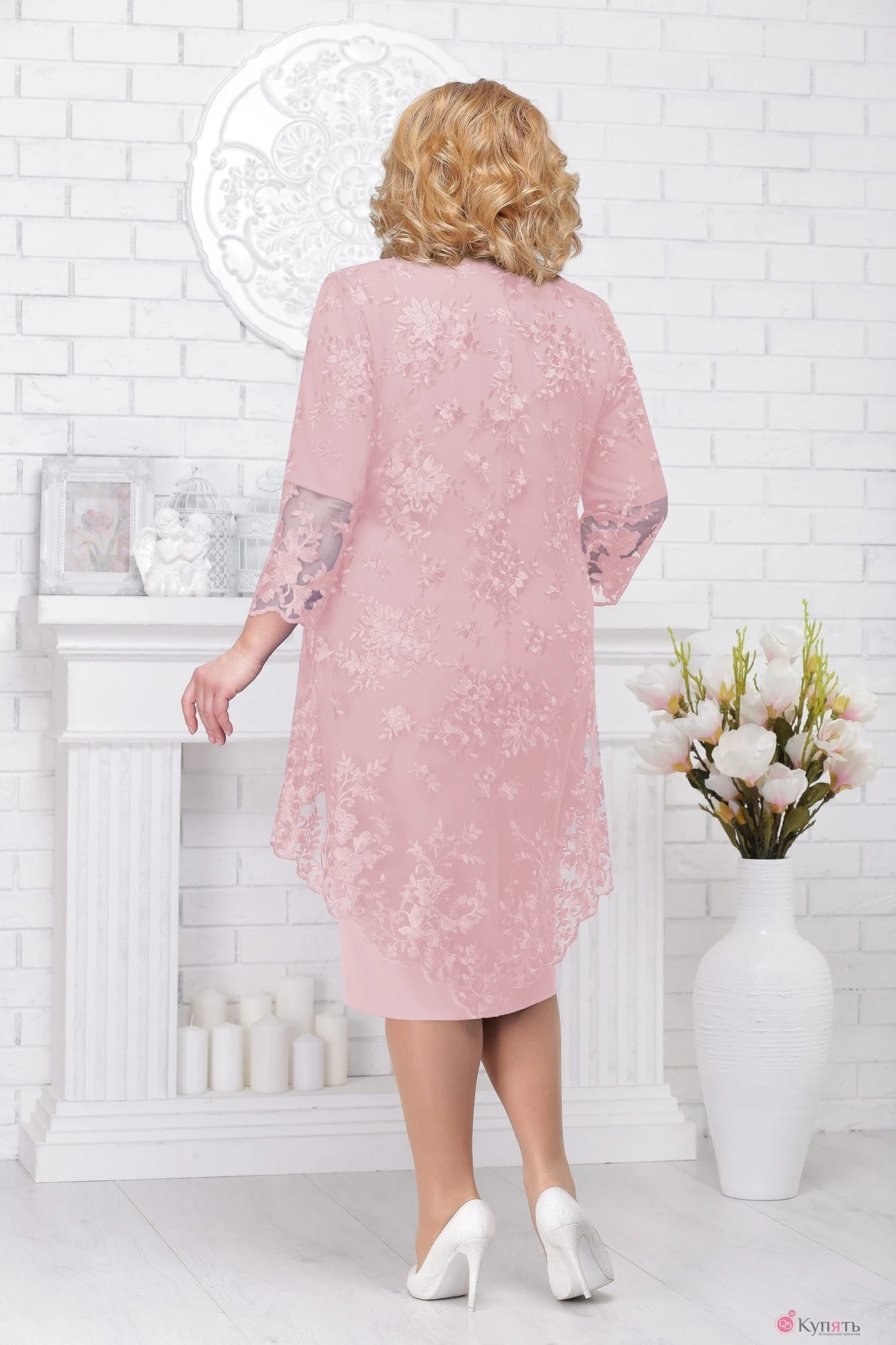Нарядный и воздушный комплект покоряет своей утонченностью. Элегантное платье прямого кроя лаконичное и сдержанное одновременно. Аккуратная округлая горловина позволит дополнить образ любимыми аксессуарами. Невероятно нежный кардиган из гипюра с удлиненной спинкой великолепно гармонирует с платьем. Его ассиметричная длина визуально скрывает недостатки фигуры, акцентируя внимание на красивых ногах. Этот наряд - идеальный вариант для светского раута или торжественного мероприятия. Комплект женский, состоящий из платья и блузки. Платье полуприлегающего силуэта, прямое от бедра, на подкладке из дышащей, приятной на ощупь и достаточно эластичной ткани. Длина посередине спинки 108 см. Рельефы на детали переда выходят из проймы, проходят через центр груди и переходят в талевые вытачки. Спинка с талевыми выточками. В среднем шве спинки обработана застёжка на потайную тесьму молнию и шлица. Рукава втачные, одношовные, с фигурным, обтачным подрезам в виде волны посередине. На подрез рукава нашиты 10-ть бусинок. Длина рукава 29 см. Горловина углублённая, обтачная, спереди в виде волны. Изделия с плечевыми накладками. Ширина рукава по линии плеча 54р – 40,5 см, 56р – 42,5 см, 58р – 44 см, 60р - 45,5 см, 62р – 47 см, 64р – 49 см, 66 – 51 см. Блузка трапециевидной формы, ассиметричной длины. Длина по среднему шву спинки 109 см., по полочке 84 см. от высшей точки плеча. Спинка с вытянутым средним швом. Рукава втачные, одношовные, длиной 50 см. Горловина углублённая, круглая, окантованная. Низ блузки и рукава с фестонами. Ширина рукава по линии плеча 54р –41 см, 56р – 43 см, 58р – 44,5 см, 60р - 46 см, 62р – 48 см, 64р – 50 см, 66 – 52 см.