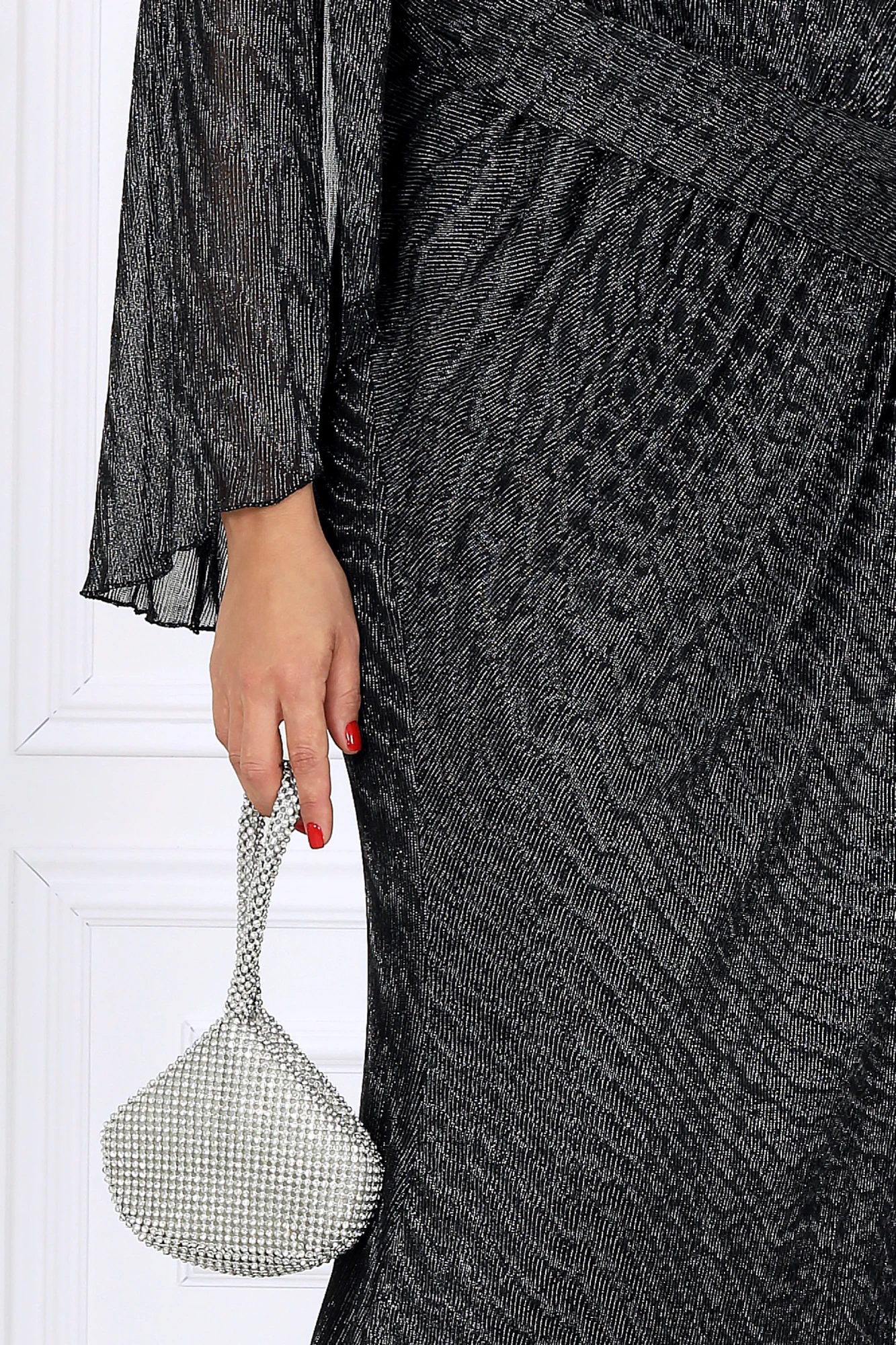 Особое внимание заслуживает рукав — лёгкий, без шва, с изящно ниспадающими краями. Его воздушность придаёт образу загадочность и утончённость, а необычный крой с драпировкой и сборкой по линии плеч делает движения пластичными и грациозными. Фигурный вырез горловины придаёт образу нотку смелости, но остаётся выдержанным и гармоничным.
