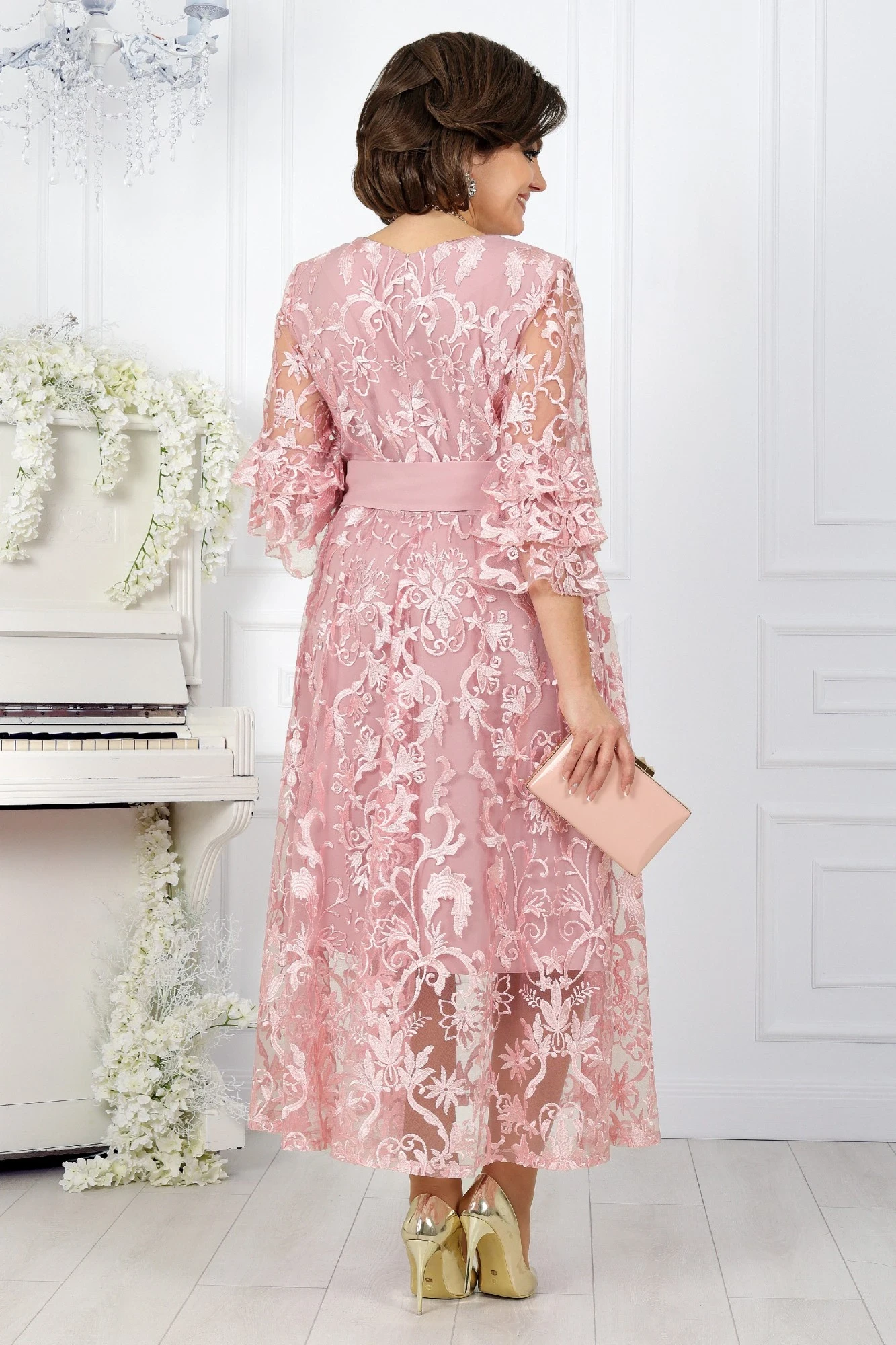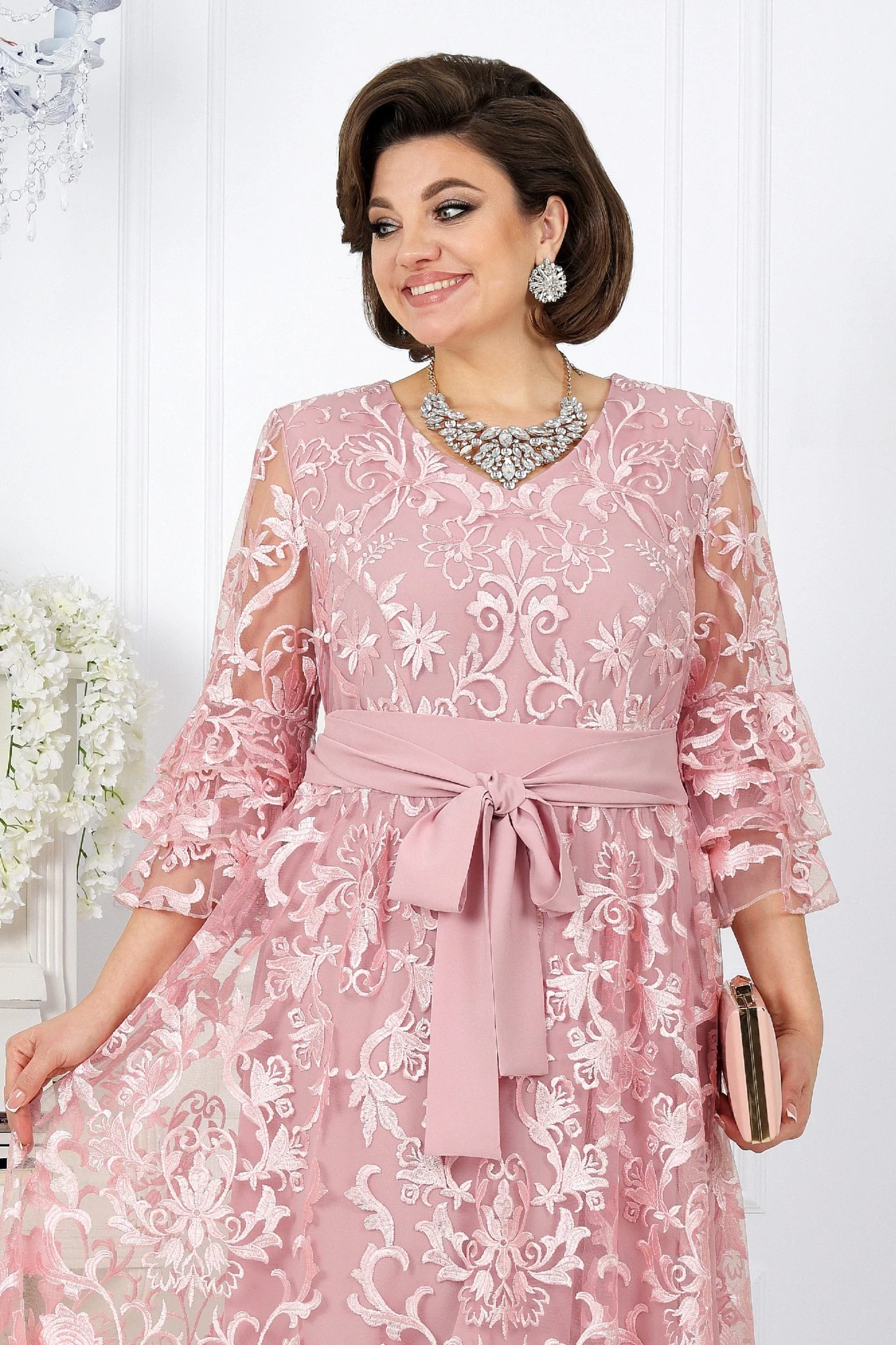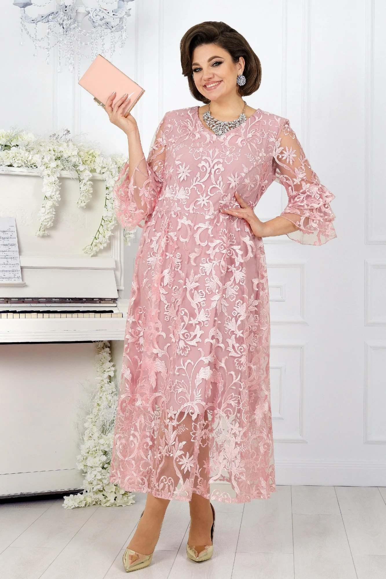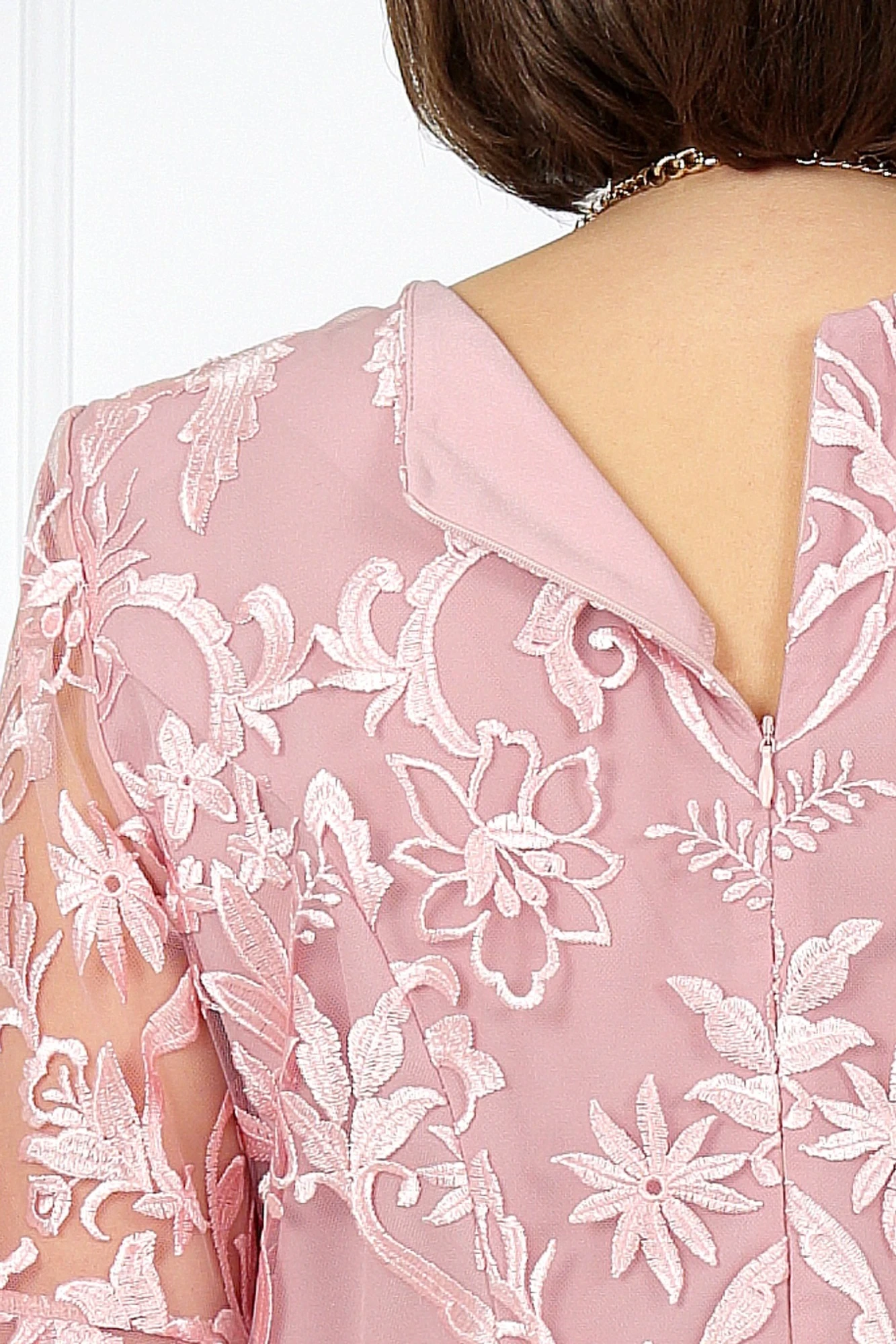 52,54,56, 58 ,60Платье женское, полуприлегающего силуэта, отрезное по линии талии, выполнено из гипюра и плательной ткани «сатин». Перед и спинка платья двухслойные: верхние слои из гипюра, нижние - из сатина. Длина по среднему шву спинки 130 см. Верхняя часть переда с рельефными швами, проходящими через центр груди и идущими от пройм вниз до шва, с подрезом, имитирующим запах. Верхняя часть спинки с рельефными швами, идущими от пройм вниз до шва. Верхняя и нижняя части спинки со средним швом, в верхней части которого расположена застежка на потайную тесьму-"молнию". Нижняя часть переда и спинки по шву талии, по гипюру собрана на сборку. Горловина спинки округлая, по переду V- образная углубленная. Рукава втачные, одношовные, из гипюра, с тремя воланами по низу рукава. Длина рукавов 49 см. Платье с плечевыми накладками, со съемным поясом из сатина.