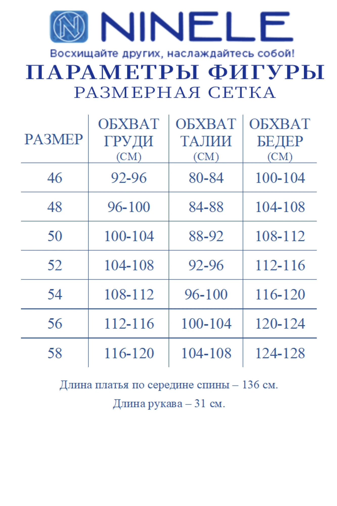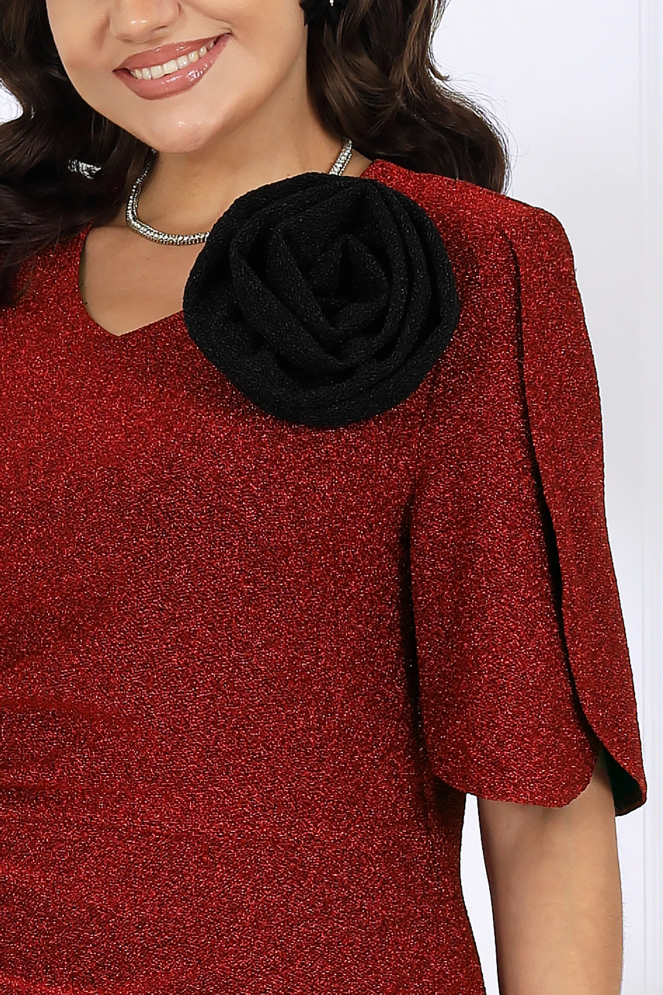Платье женское полуприлегающего силуэта, выполнено из трикотажного полотна с фактурной лицевой стороной «люрекс». Модель на трикотажной подкладке, с плечевыми накладками. В левом боковом шве расположена застежка на потайную тесьму-«молнию» (35 см). Перед платья со смещенным к боковому шву рельефом, идущим от проймы до низа; в нижней части рельефа обработан разрез. Левая часть переда отрезная по линии талии, с односторонними горизонтальными складками, направленными от рельефа к центру. Спинка с талиевыми вытачками. Горловина спинки округлая, по переду V-образная, углубленная. Рукав короткий, втачной, формы «крылышко на запах», со скругленными срезами. Платье дополнено съемным «цветком» из основного полотна. Длина платья - 136 см; длина рукава - 34 см.
