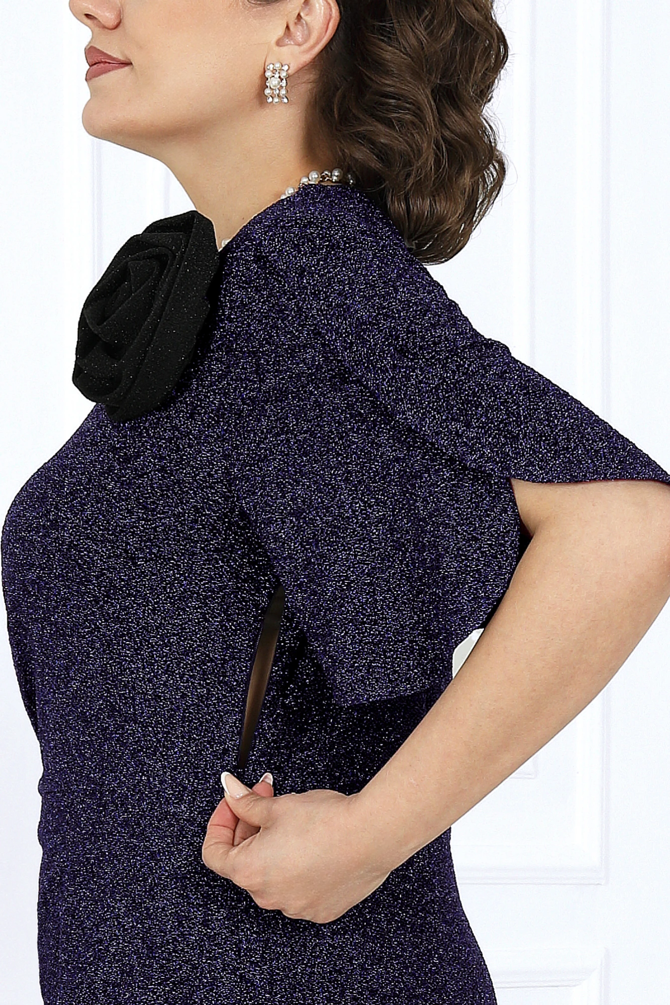 Платье женское полуприлегающего силуэта, выполнено из трикотажного полотна с фактурной лицевой стороной «люрекс». Модель на трикотажной подкладке, с плечевыми накладками. В левом боковом шве расположена застежка на потайную тесьму-«молнию» (35 см). Перед платья со смещенным к боковому шву рельефом, идущим от проймы до низа; в нижней части рельефа обработан разрез. Левая часть переда отрезная по линии талии, с односторонними горизонтальными складками, направленными от рельефа к центру. Спинка с талиевыми вытачками. Горловина спинки округлая, по переду V-образная, углубленная. Рукав короткий, втачной, формы «крылышко на запах», со скругленными срезами. Платье дополнено съемным «цветком» из основного полотна. Длина платья - 136 см; длина рукава - 34 см.
