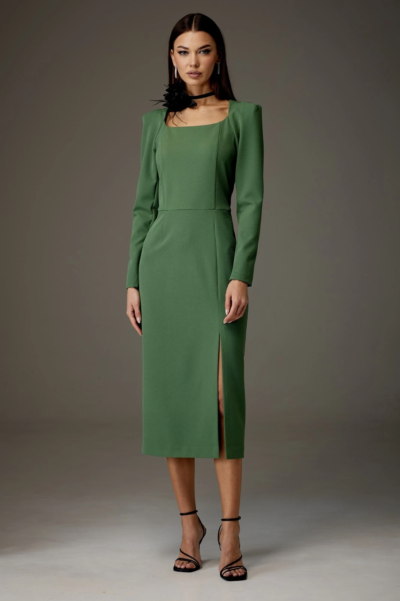 Спинка со средним швом, в котором расположена тесьма-молния. Спереди слева, по линии ноги, расположен разрез. Рукав традиционной формы со складкой по окату.