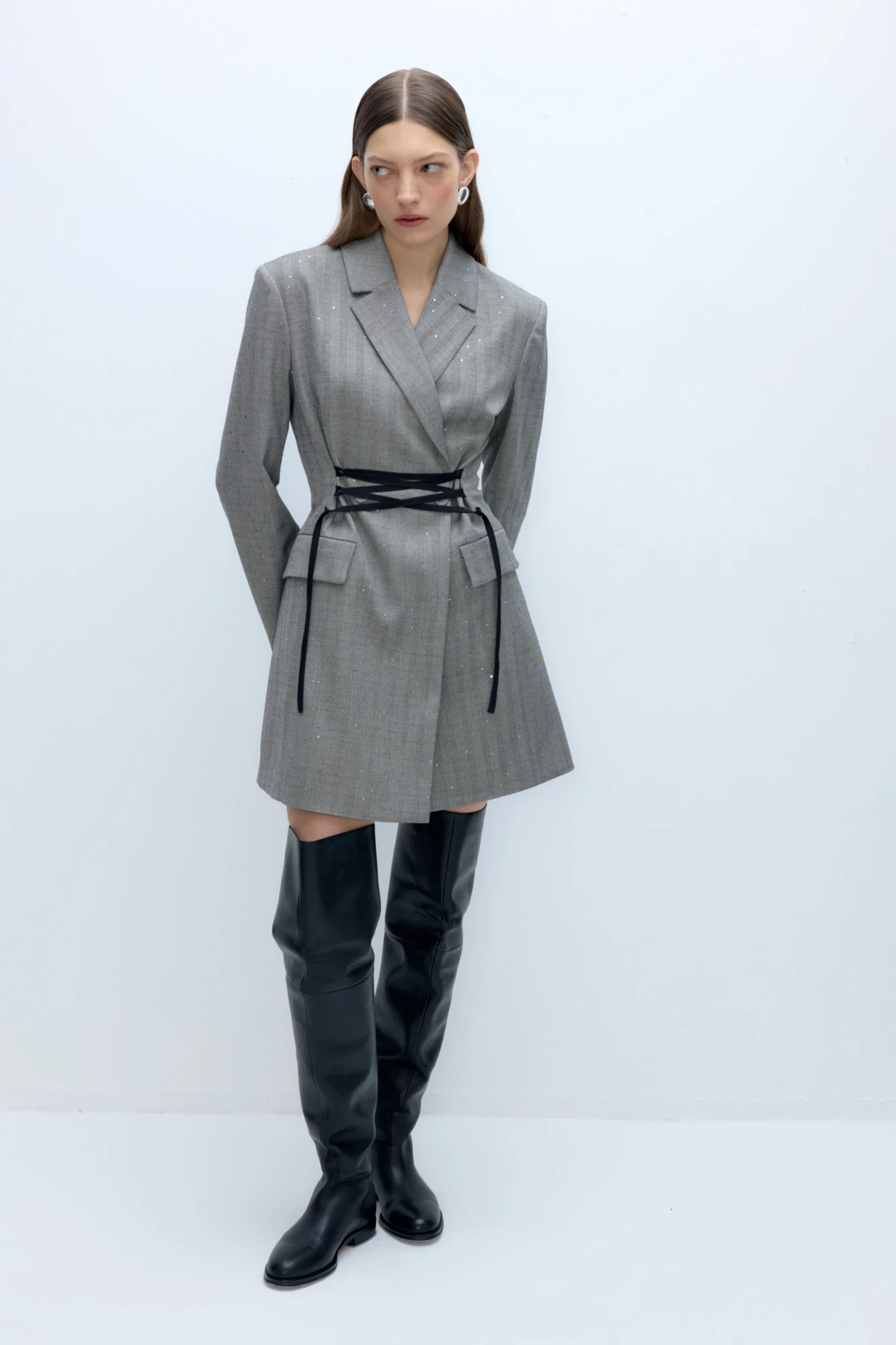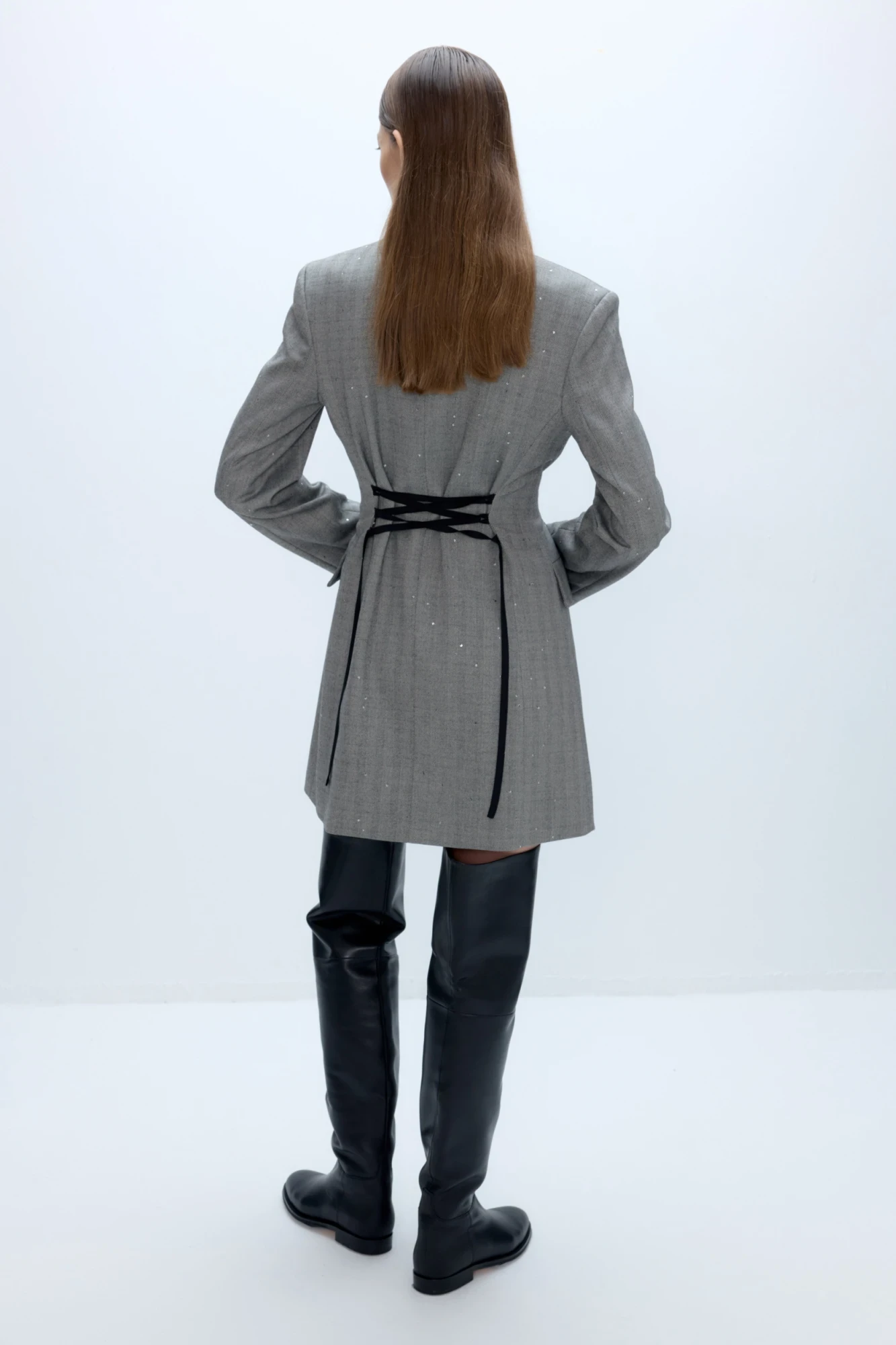 Детали: полуприлегающий силуэт, рельефы, пиджачный воротник, застежка на две петли и пуговицы, функциональные карманы, платье на подкладке 100% хлопок. Платье можно зашнуровать двумя способами- по бокам и по центру.