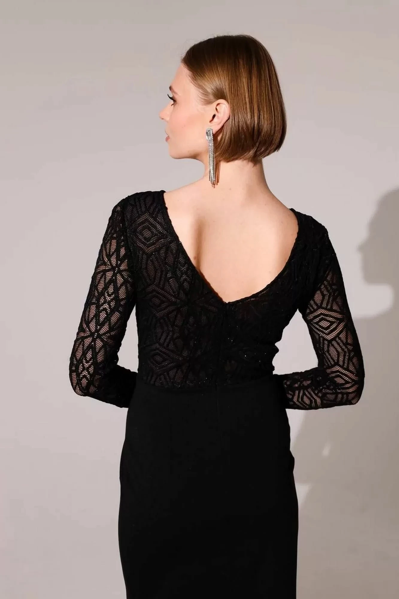 Ажурный материал рукавов переносит акцент на верхнюю часть силуэта.