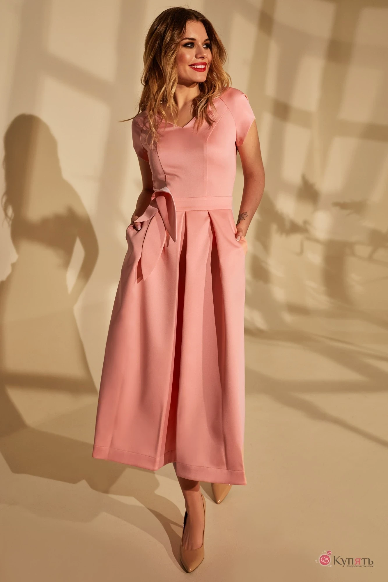 Цветовая гамма для верха, подкладки, фурнитуры, отделки: платье из ткани в одной цветовой гамме. Перед декорирован пришивным декоративным элементом. По спинке платье длиннее, чем спереди.