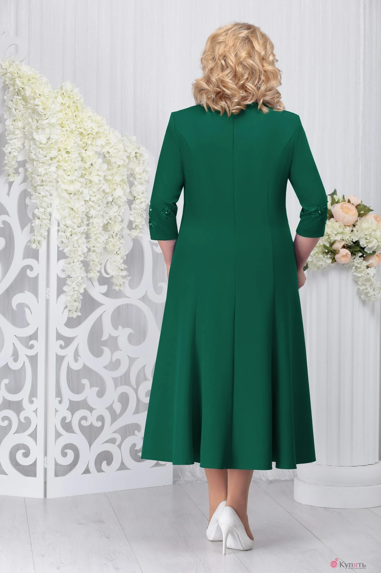 Нарядное платье полуприлегающего силуэта очень удачно скрывает несовершенства фигуры. Благодаря широкому вшитому поясу модель делает талию более стройной и грациозной. Расширяющаяся книзу юбка делает образ нежным и женственным. Верхняя часть платья украшена декоративными аппликациями в виде симпатичных маленьких цветочков с бусинками. Элегантную нотку придает модели классическая круглая горловина. Рукава три четверти также украшены небольшими цветами. Платье женское, полуприлегающего силуэта, спереди отрезное по линии талии, со вставкой в виде пояса, на подкладке из дышащей, приятной на ощупь и достаточно эластичной ткани. Длина по среднему шву спинки 118,0 см. На детали переда рельефы выходят из проймы, проходят через центр груди вниз к поясу. Юбка покроя “годе”. Спинка с рельефами, выходящими из проймы вниз и со средним швом, в котором обработана застёжка на потайную тесьму молнию. Горловина углублённая спереди, круглая, обтачная. Рукава втачные, одношовные, длиной 43,0 см. На средней части переда и по низу рукава нашиты аппликации - цветы с бусинками. Изделие с плечевыми накладками. Ширина рукава по линии плеча/ Ширина платья на уровне талии, см 56р – 42/106 см, 58р – 44/110 см, 60р - 46/114 см, 62р – 48/118 см, 64р – 50/122 см.