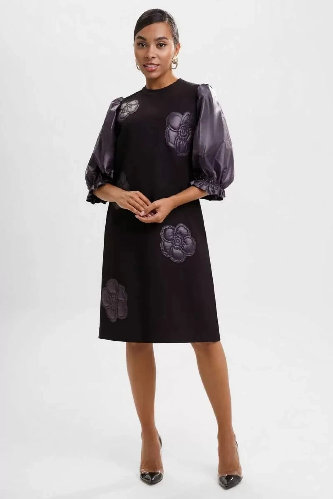 Платье женское прямого силуэта из костюмно-плательной ткани, длиной за колено, с объемной аппликацией по переду. Перед платья без нагрудных вытачек. Спинка цельнокроенная. В боковых швах обработаны карманы в шве. Рукава втачные одношовные, длиной ¾, из отделочной ткани со сборкой по окату и резинкой по низу. Горловина круглой формы с притачной планкой.