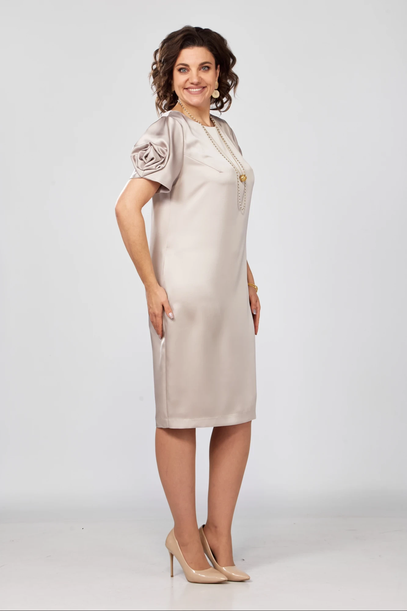 Перед с нагрудными выточками. Вырез горловины округлый. Спинка прямая с застежкой сверху на петлю-пуговицу. Рукав короткий втачной с декоративной розой, сформированной из основной ткани. Такой рукав не только украсит платье, но и сделает его неповторимым!