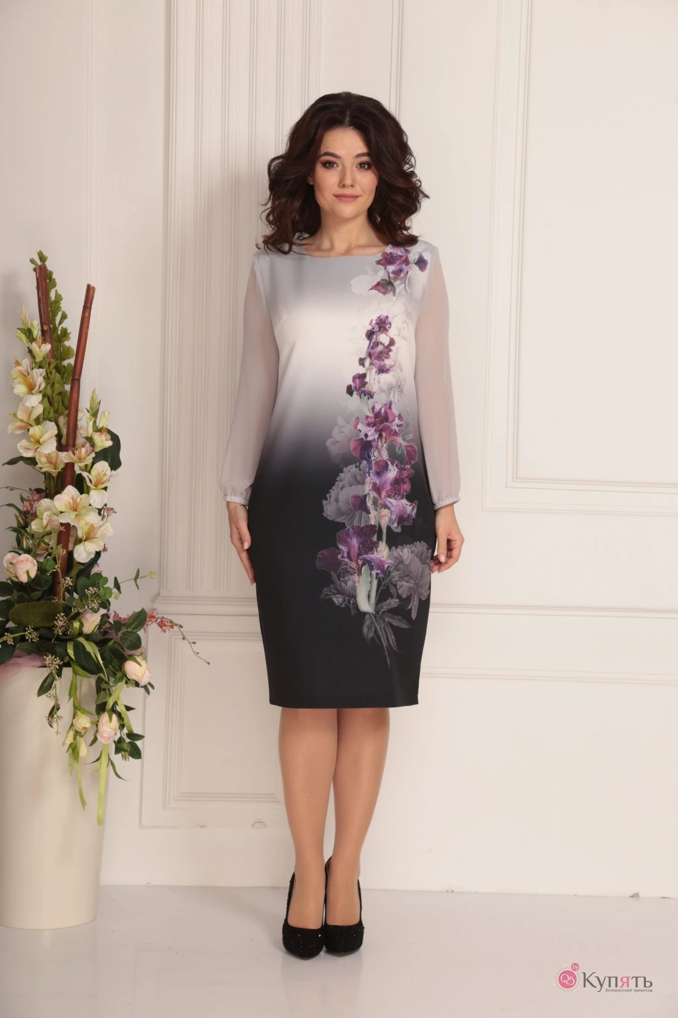 Платье женское приталенного силуэта. По переду нагрудные выточки. Спинка со средним швом,переходящим в шлицу и талевыми выточками. Горловина-округлая. Рукав втачной, 3/4 из шифоновой ткани,заканчивающийся манжетой на резинке. Ткань немного тянется.