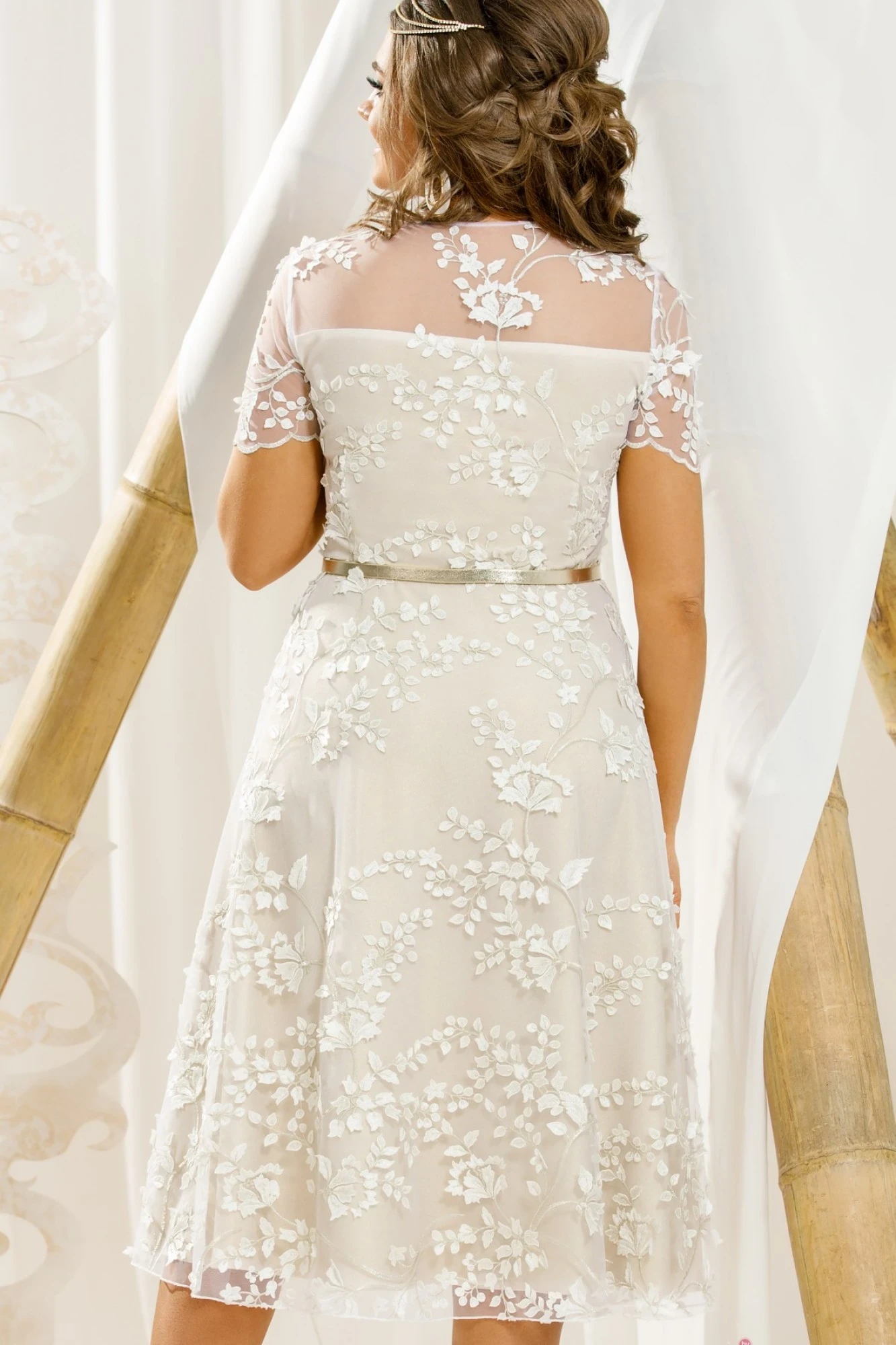 Настоящая позитивная куколка! Выглядите очень нежно, силуэт подчеркивает вашу романтичную натуру, гипюр с эффектом 3D актуален. Платье, отрезное по линии талии, прилегающее в верхней части и расклешённое в нижней, выполнено из гипюра с подложкой. По переду расположены нагрудные и талиевые вытачки, отрезная линия талии подчёркнута съёмным поясом, вырез горловины округлой формы, по спинке расположены талиевые вытачки, в левом боковом шве расположена застёжка потайная молния. Рукав втачной, короткий. Длина рукава 18 см (р-р 46-48), 20 см (р-р 50-54). Длина платья 115 см (р-р 46-48), 120 см (р-р 50-54).