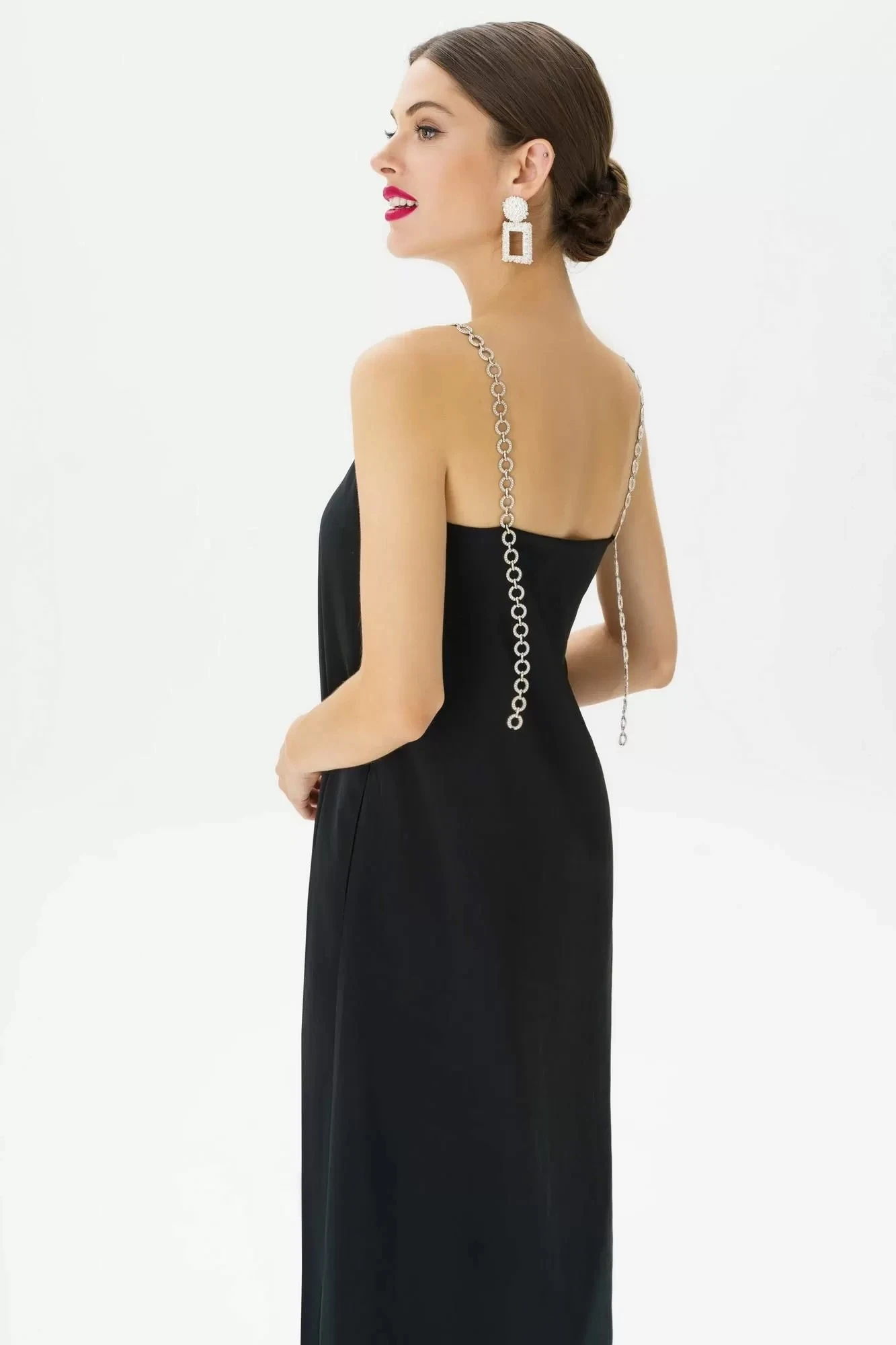 46,48Платье женское, нарядное на бретелях из металлической цепи с камнями (фурнитура может незначительно отличаться от фото), полуприлегающего силуэта, расширенное к низу. Платье на подкладке.