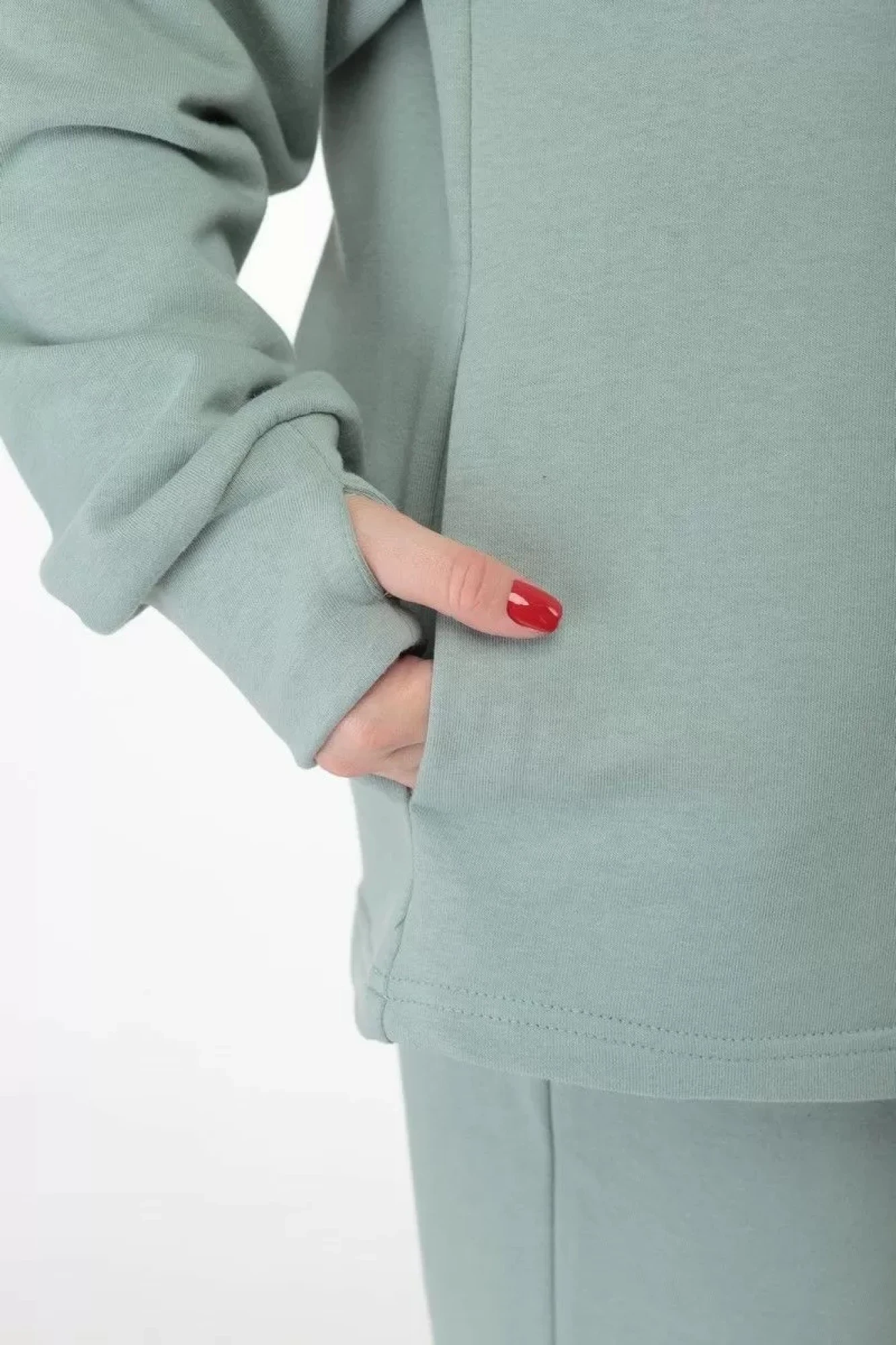 Отличается свободным кроем свитшота-худи, декоративными элементами из ткани-компаньона, свободными рукавами на манжете-перчатке. Функциональные карманы в боковых швах. Удобный и с подкладкой капюшон.