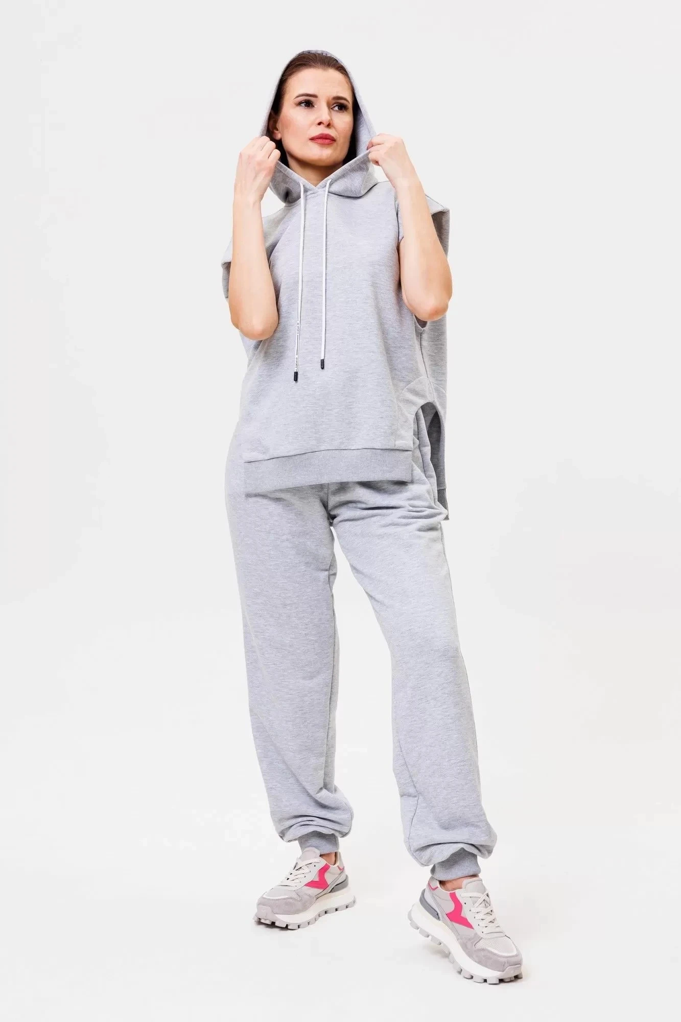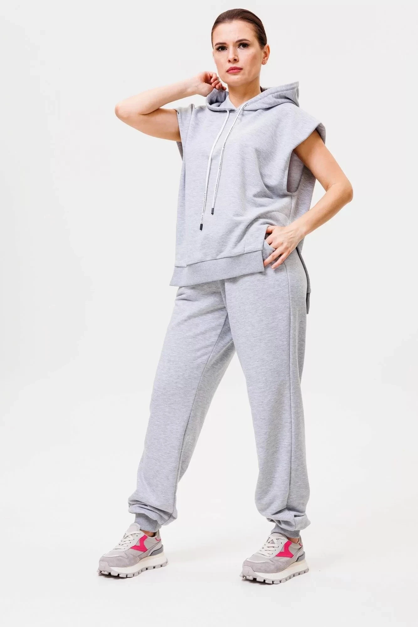Длина брюк по боковому шву с шириной пояса и манжета 114 см. Рост модели на фото 166 см.