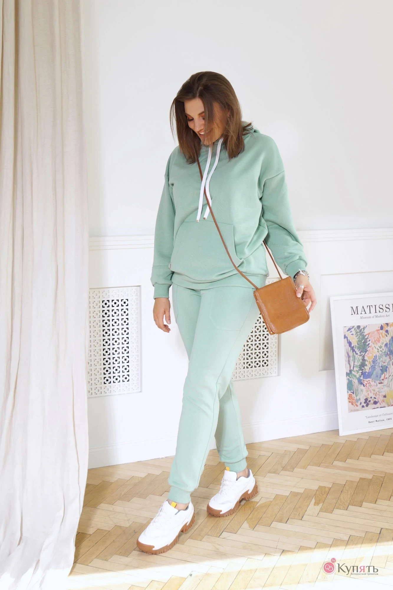Худи, выполнен в стиле оверсайз. Рукав имеет спущенную пройму по линии плеча. Передняя часть, дополнена карманом «Кенгуру». Объёмный, двойной капюшон прекрасно держит форму. Брюки высокой посадки с широким поясом на резинке и шнурком. Спереди имеются притачные карманы. Отрезная кокетка на задней части брюк делает их посадку идеальной. Все манжеты обработаны хлопковым трикотажным полотном с фактурой в стиле «английской резинки».