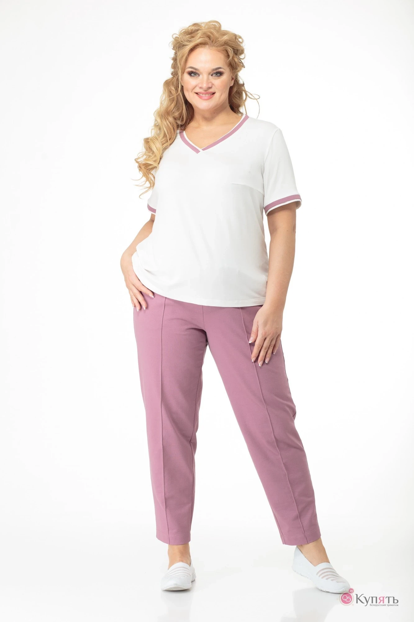 Брюки прямые, по центру передних половинок застрочен защип, на уровне бедер прорезные карманы с листочкой. Верх брюк оформлен поясом на резинке.