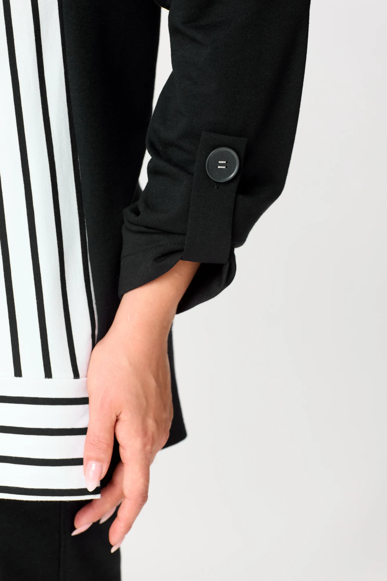 Блузон полуприлегающего силуэта, со спущенной проймой, правая часть переда, карман и планка низа выполнены из трикотажа в полоску. Горловина круглая с планкой, рукава длинные, по низу застегиваются на пату.