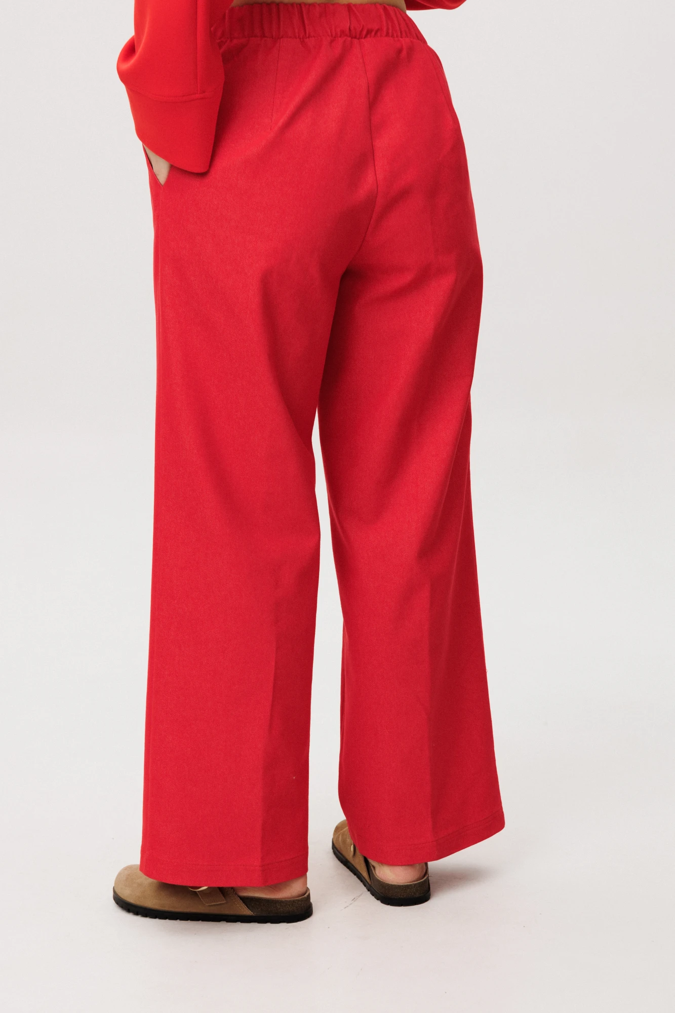 Брюки в расслабленном стиле, на эластичном поясе с наклонными боковыми карманами и кантом-защипом по передним половинкам брюк.