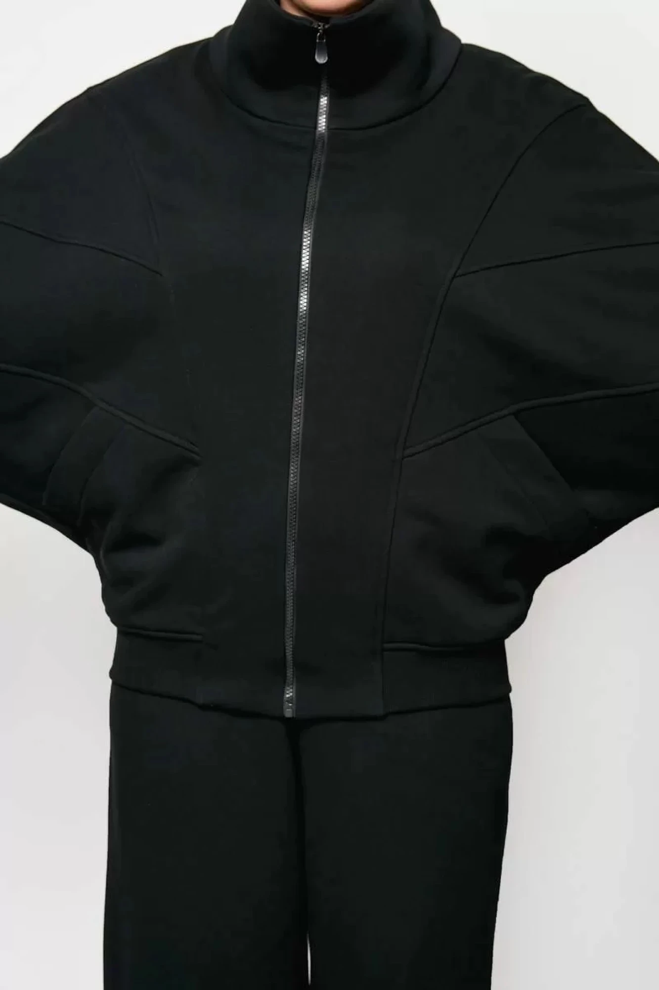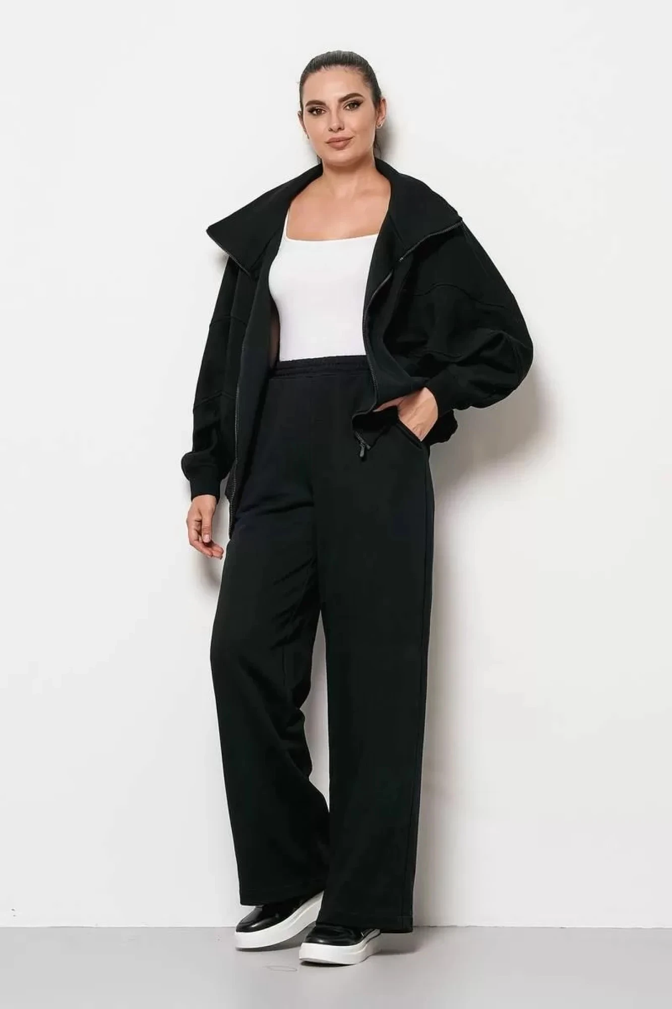 ьными карманами в боковых швах расширяются к низу, пояс брюк полностью на резинке.