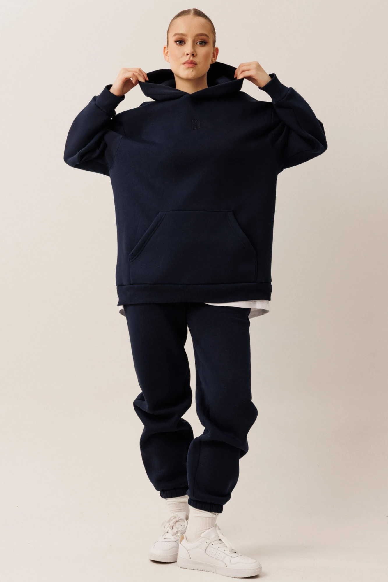 Худи имеет двойной капюшон и карман кенгуру. По центру переда вышивка-логотип в цвет ткани. Рукава имеют притачную манжету. Манжеты рукавов и низ изделия выполнены из ткани- компаньона кошкорсе.
