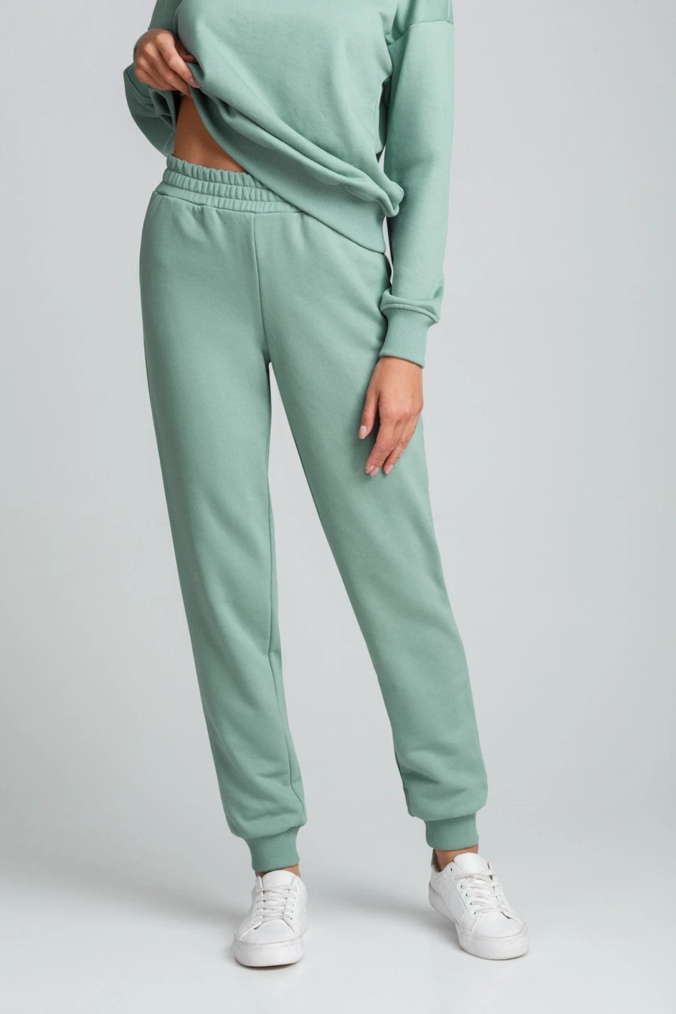 Пояс на резинке. По низу брючины сосборены на манжеты. Спереди косые боковые карманы.