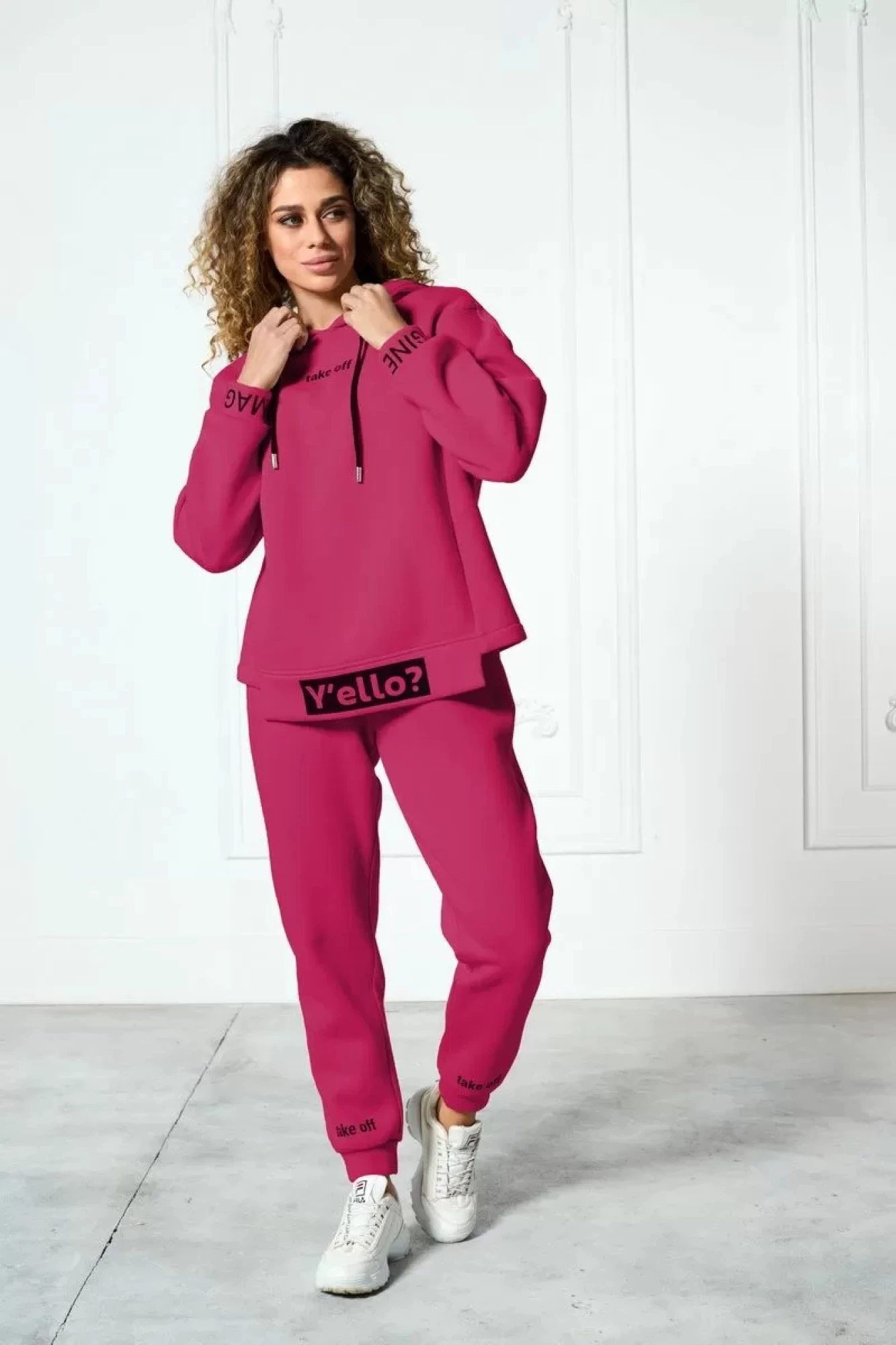 Брюки прямого свободного кроя с боковыми карманами . Пояс брюк резинка со сборкой. На полочке, манжетах рукавов и внизу брюк декоративная печать.