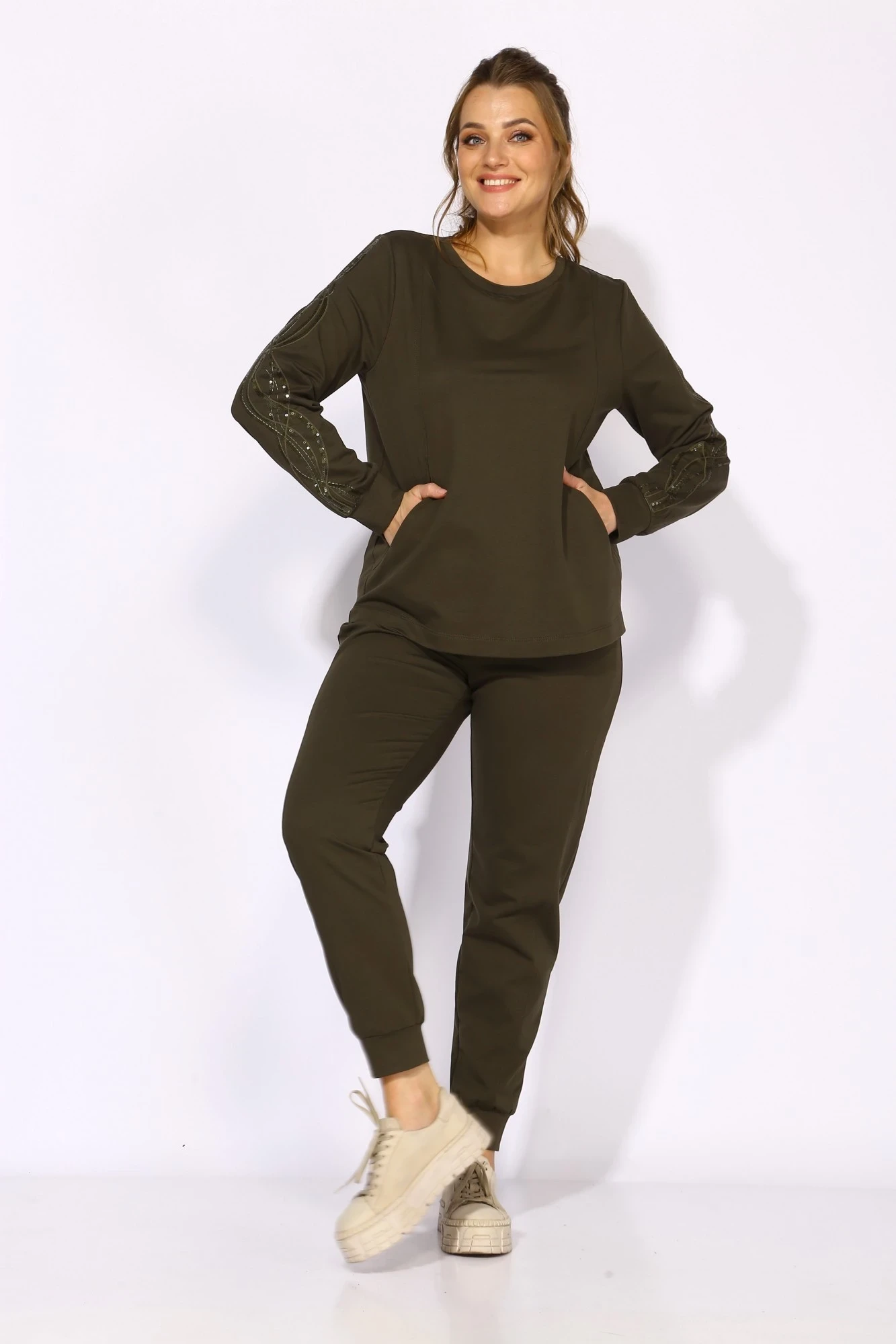 Свитшот прямого силуэта с длинным втачным рукавом. Рукава по низу на манжете и задекорированы вышивкой шнуром с паетками. По переду фигурные рельефы с отделочной строчкой. Карманы в рельефах. Горловина круглая с подрезной бейкой. Спинка без особенностей. Брюки длинные, по низу на манжете. Спереди и сзади по брюкам диагональные подрезы с отделочной строчкой. Пояс притачной с резинкой по кругу.