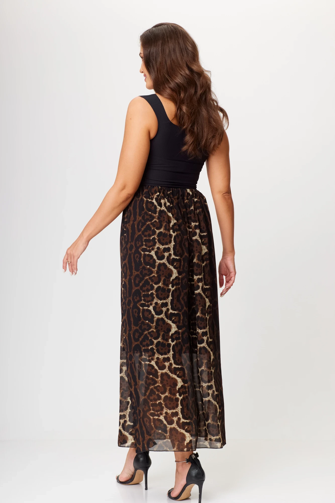 шифоновой юбке на подкладке. А ультрамодный животный черно-бежевый принт придает особую изюминку вашему гардеробу, позволяя благодаря такой расцветке, носить эту юбку, создавая модные луки не только летом, но и осенью, и весной, сочетая с объемными свитерами или кожаными куртками. Эта юбка с поясом на широкой резинке, длинная с боковым разрезом. Необычный и стильный винтажный крой делает ее универсальной - она подойдет как для молодежного, спортивного, так и для классического образа. Подчеркните свою женственность и элегантность этой прекрасной милой шифоновой юбкой от бренда «АХХА».